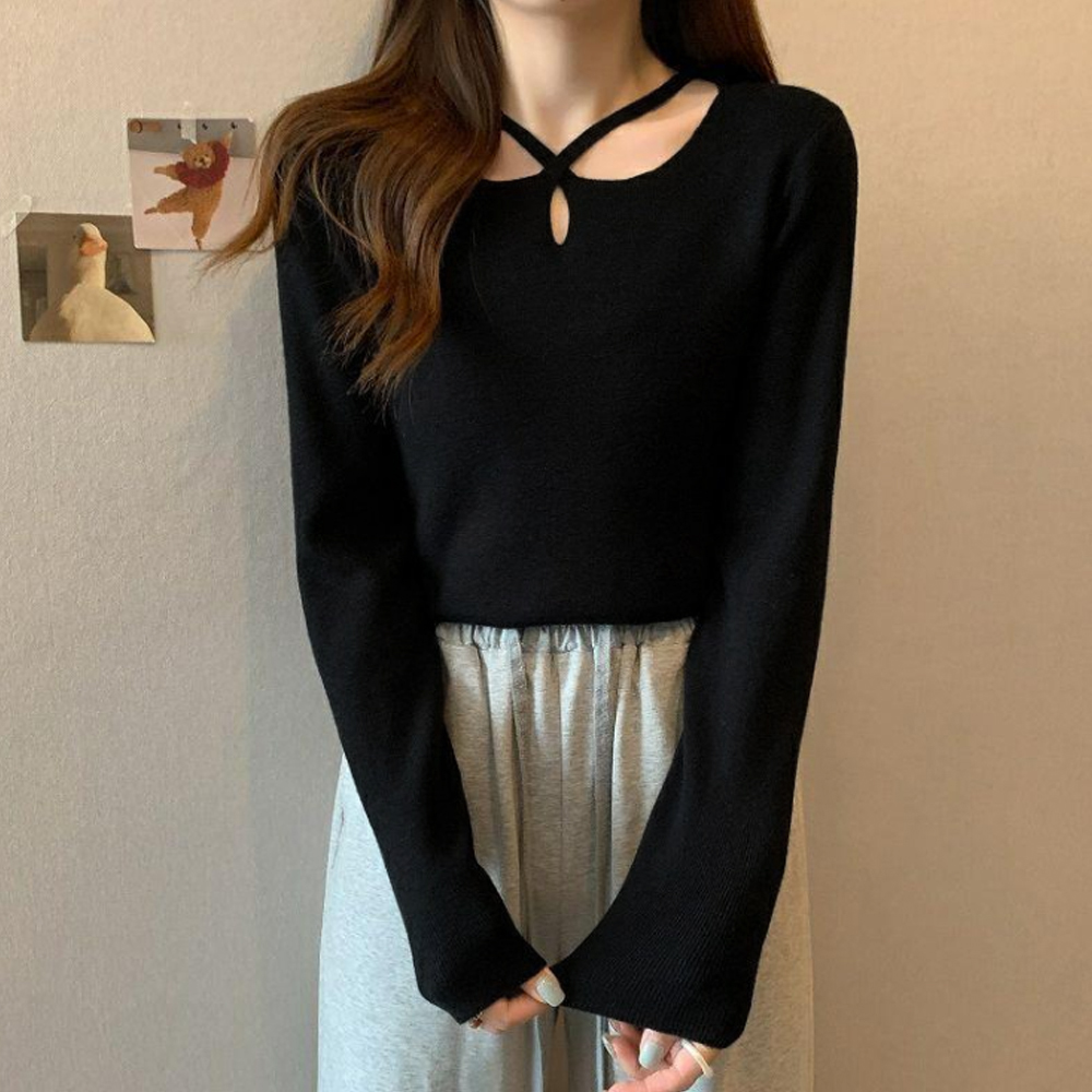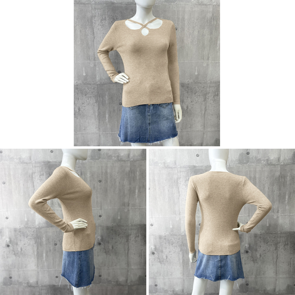 大人女性に合う上品なクロスネックデザインのリブニットトップス