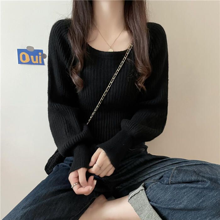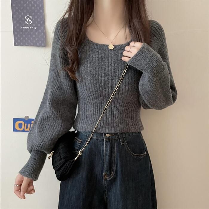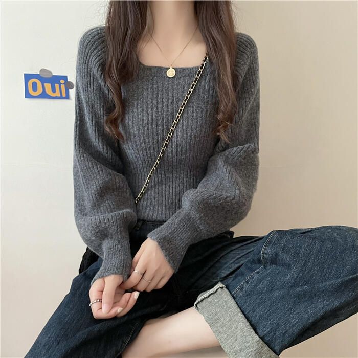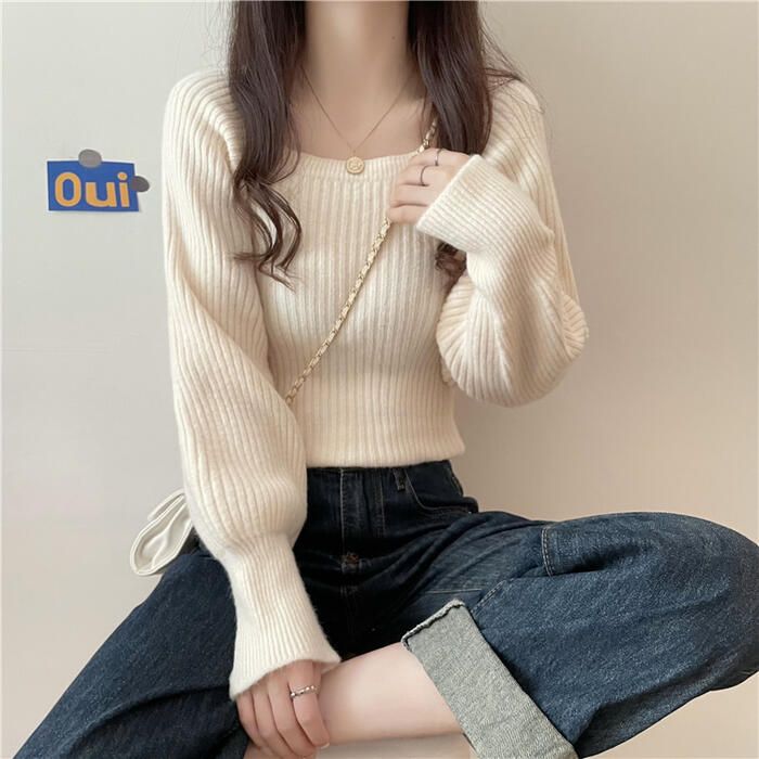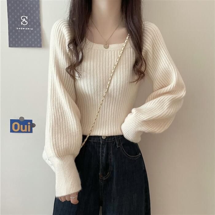 トップス ニット スクエアネック セーター 長袖 パフスリーブ ホワイト カットソー おしゃれ レディース ベージュ 白 きれいめ ベーシック 通勤 ブ カジュアル