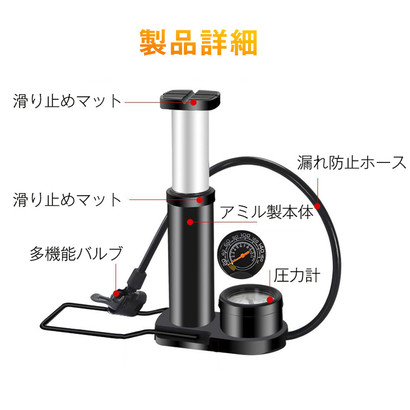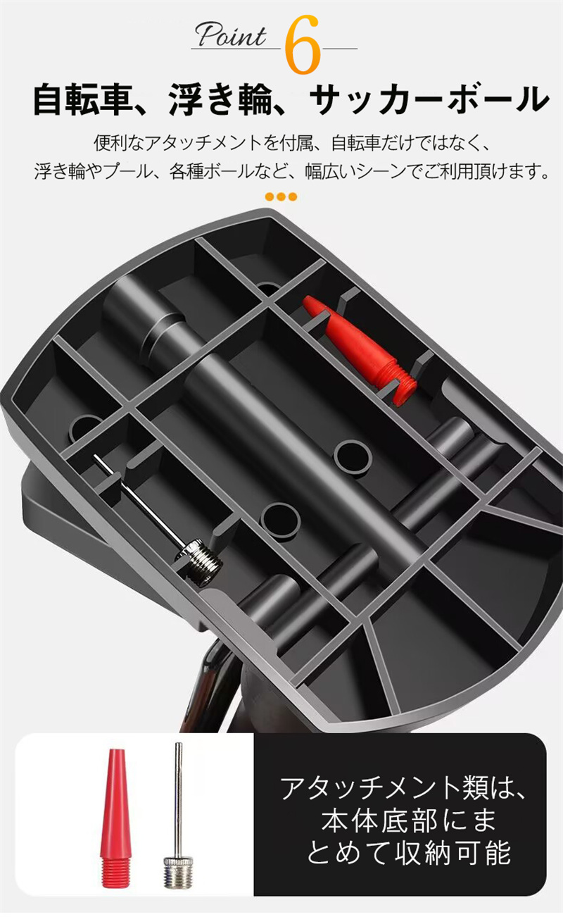 ハンドル式のものより楽々と効率的に空気入れができます。ロードバイク、自転車、ボール、浮き輪など広い場合で大活躍しています