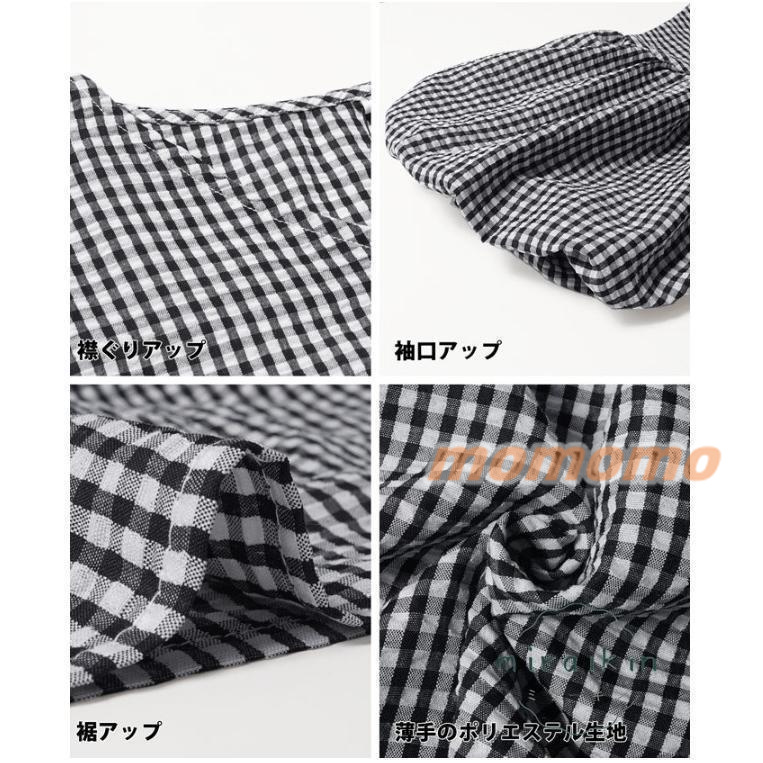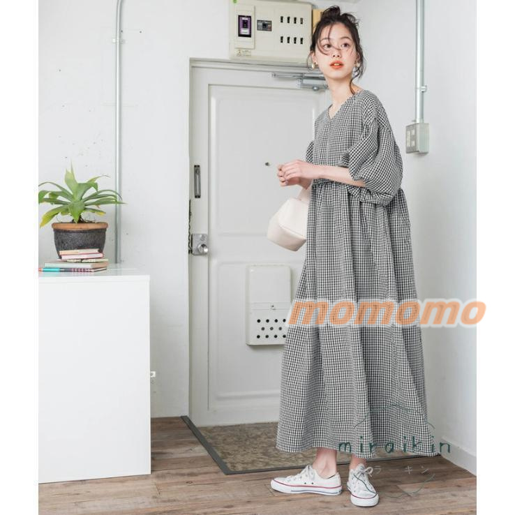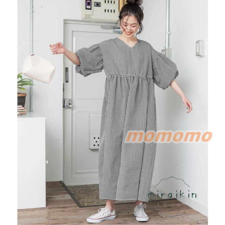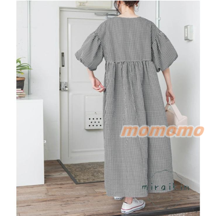 ワンピース レディース 春 夏 ロングワンピース 半袖 ゆったり大人 Aラインワンピース フリル ボリューム 五分袖 Vネック ギャザー チェック柄 パ