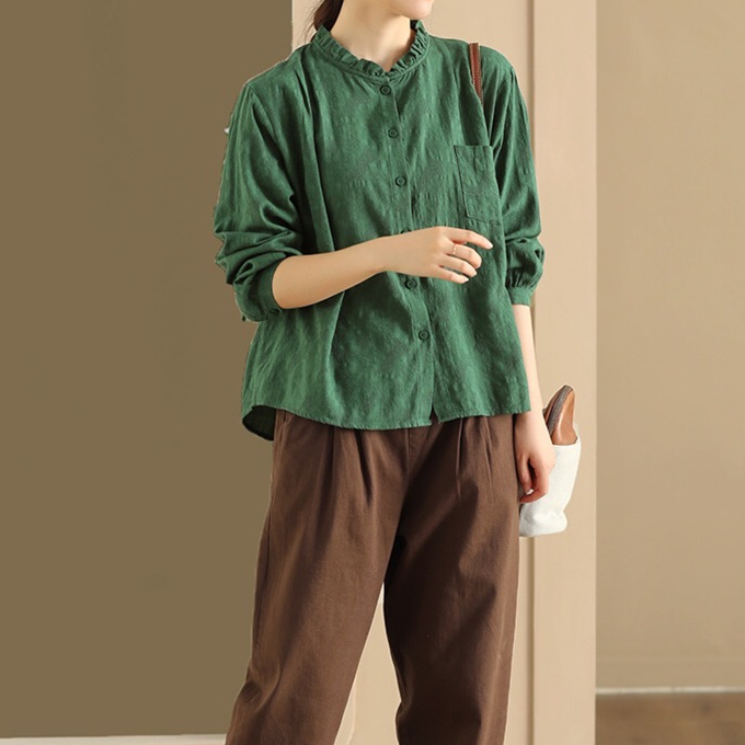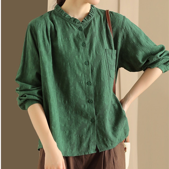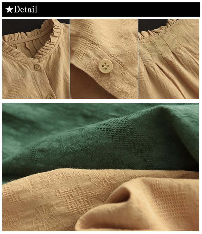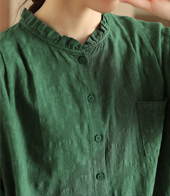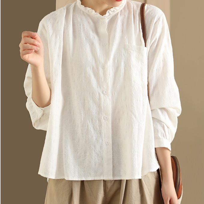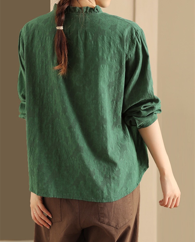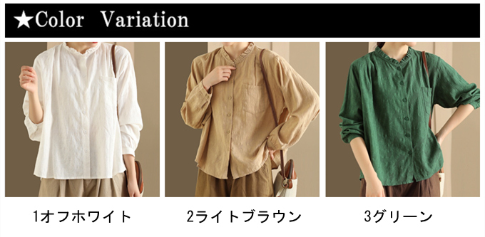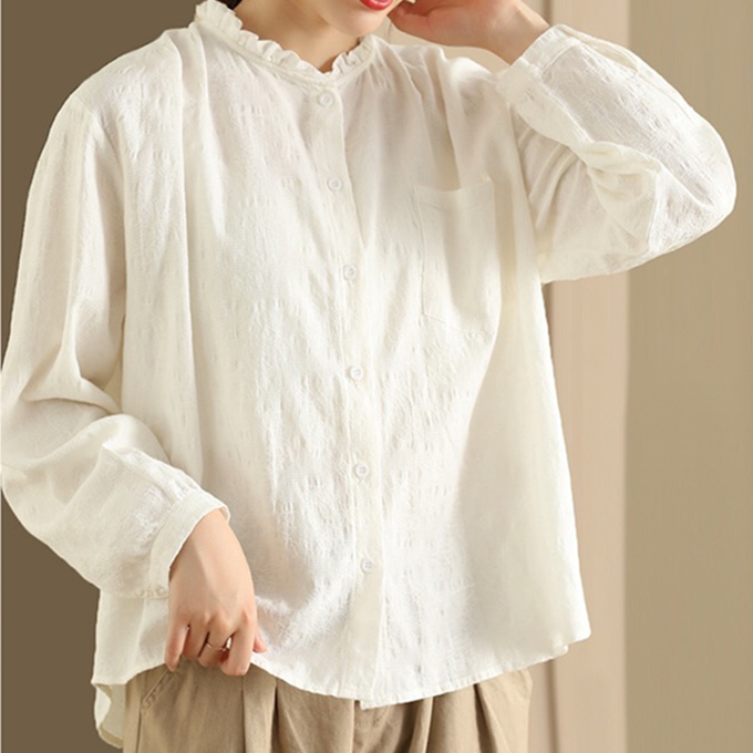 レディース トップス ブラウス 長袖 綿 シャツ 模様織 ジャガード 花柄 無地ライク ゆったりサイズ フリル フラワー立襟 ゆったり スタンド凹凸 コットン