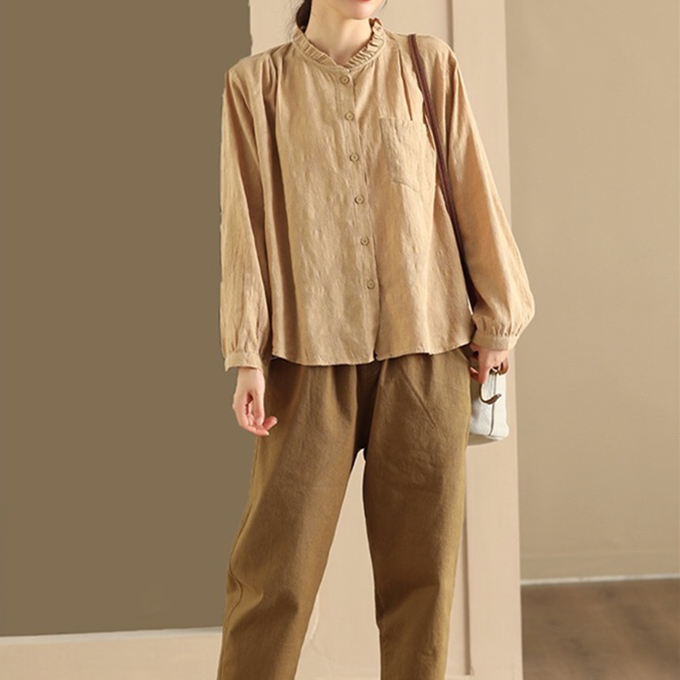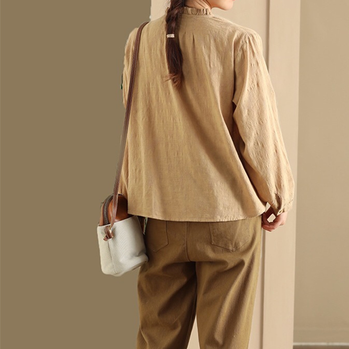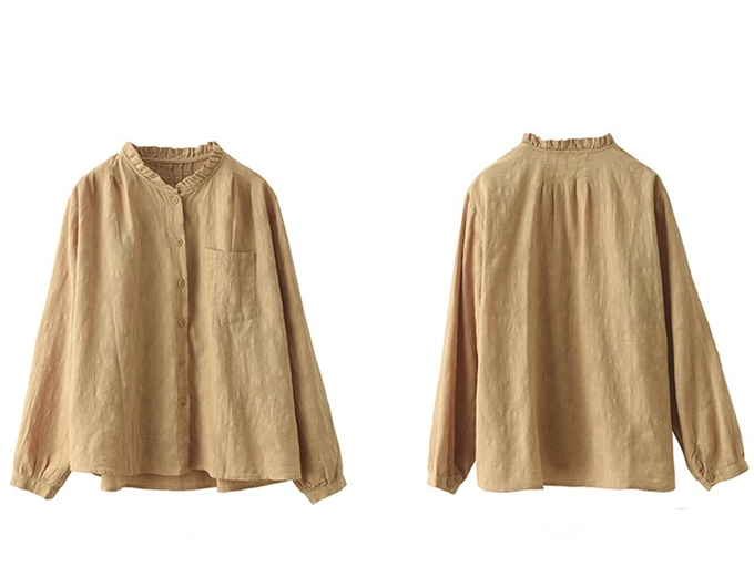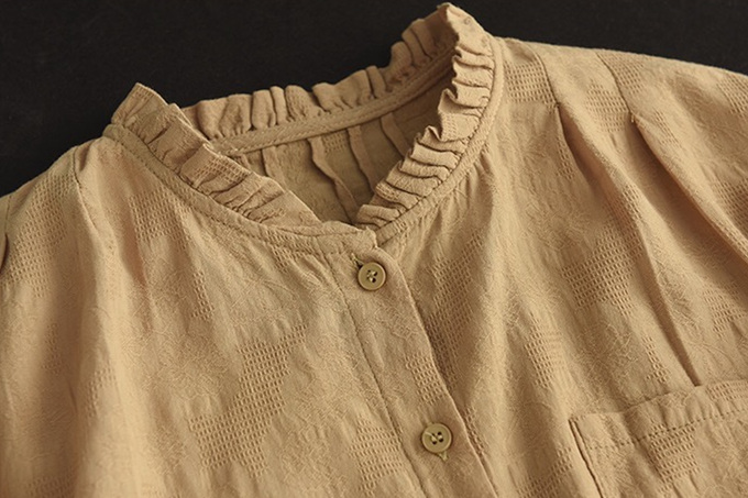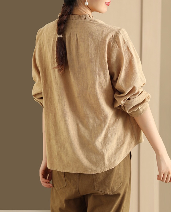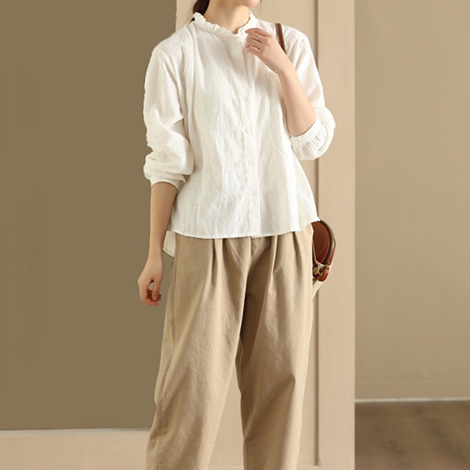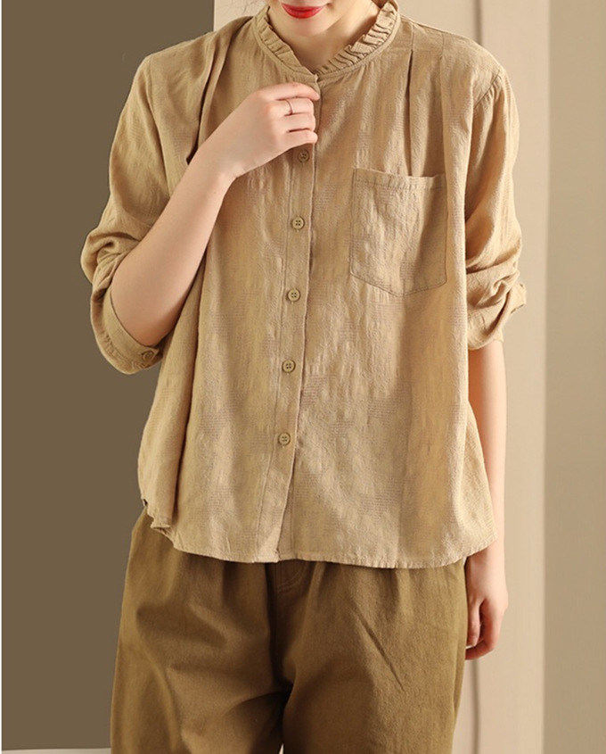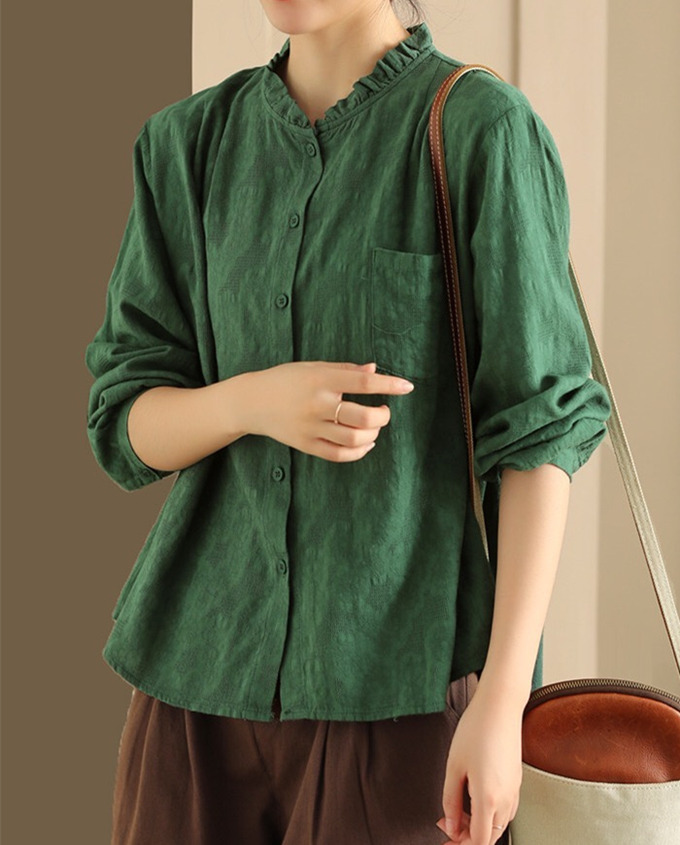 レディース トップス ブラウス 長袖 綿 シャツ 模様織 ジャガード 花柄 無地ライク ゆったりサイズ フリル フラワー立襟 ゆったり スタンド凹凸 コットン
