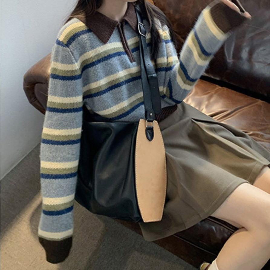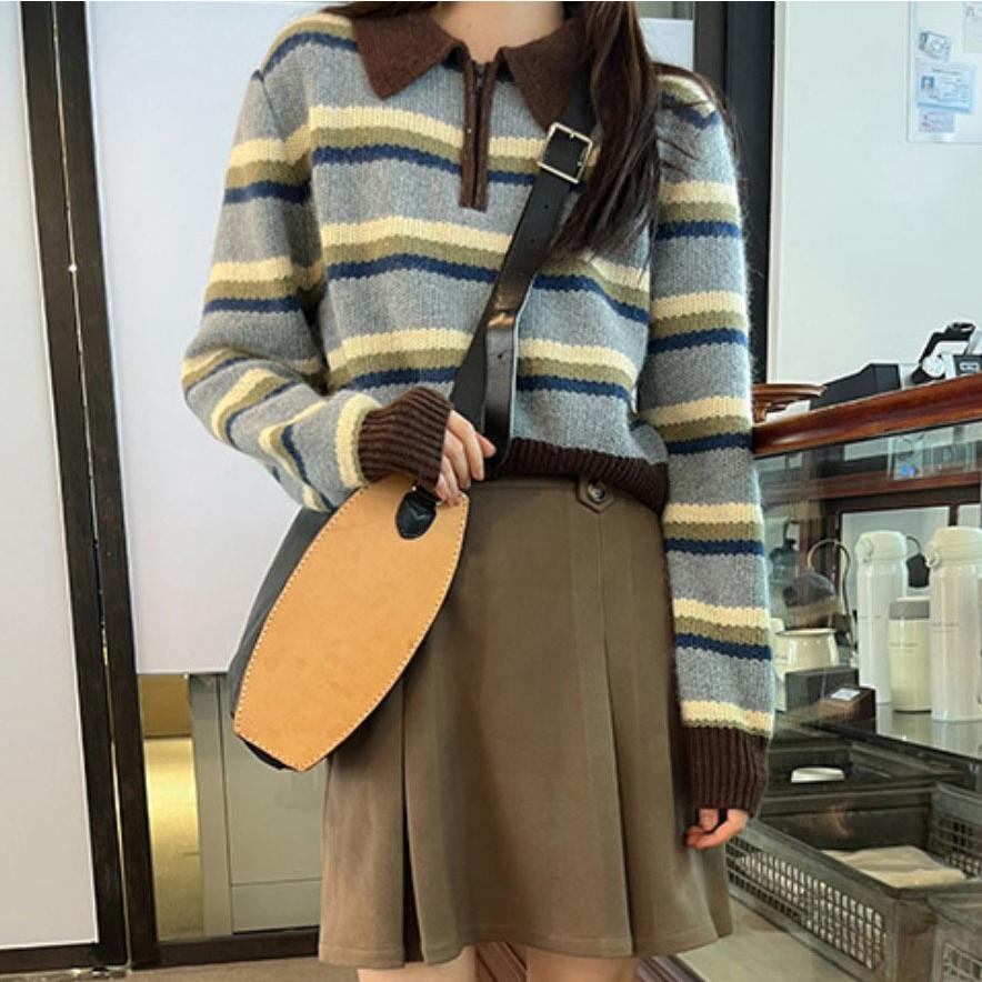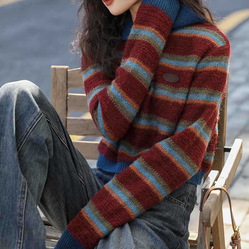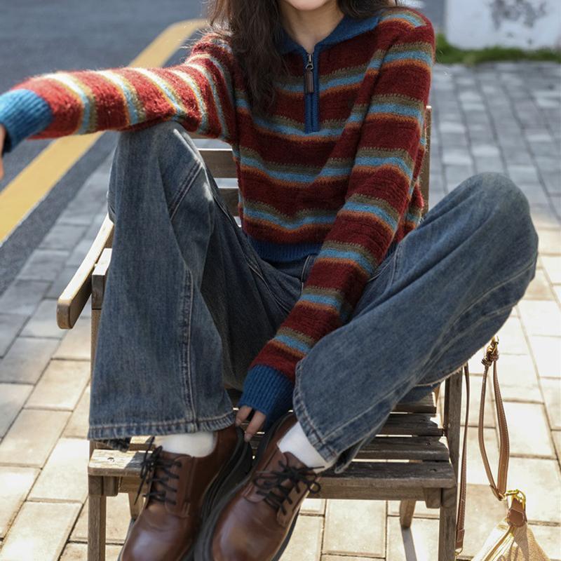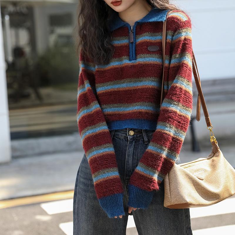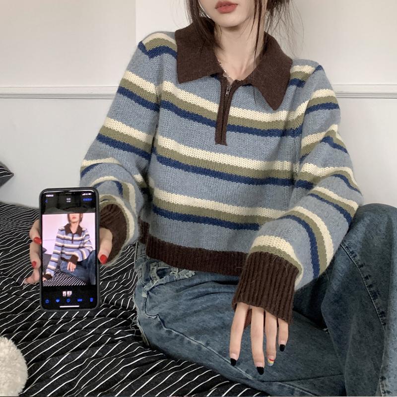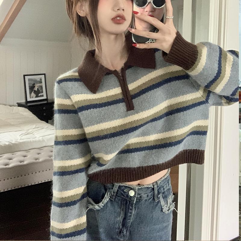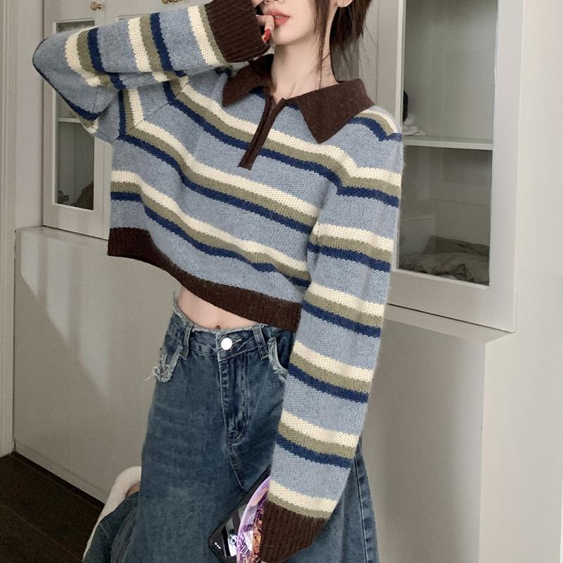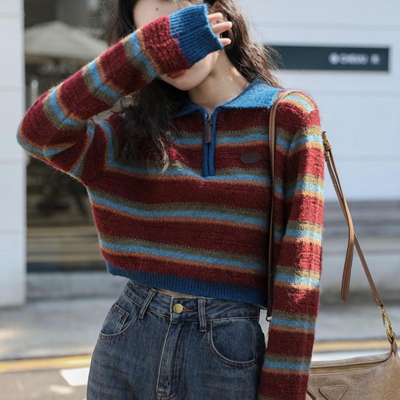 ショート 丈ストライプセーター レディース 春の新作 ハーフジップニットトップス 長袖セーター 通勤 通学