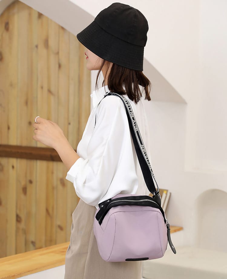 太めのショルダーベルトはカジュアルな印象で、英文字入りデザインがおしゃれさをプ。