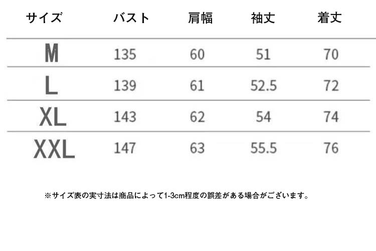 サイズについての説明:サイズ バスト 肩幅 袖丈 着丈※サイズ表の実寸法は商品によって1-3CM程度の誤差がある場合がございます。