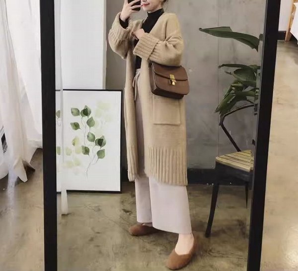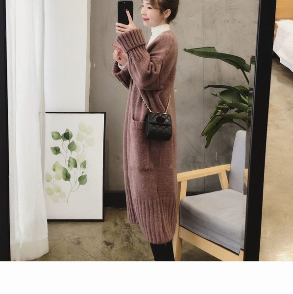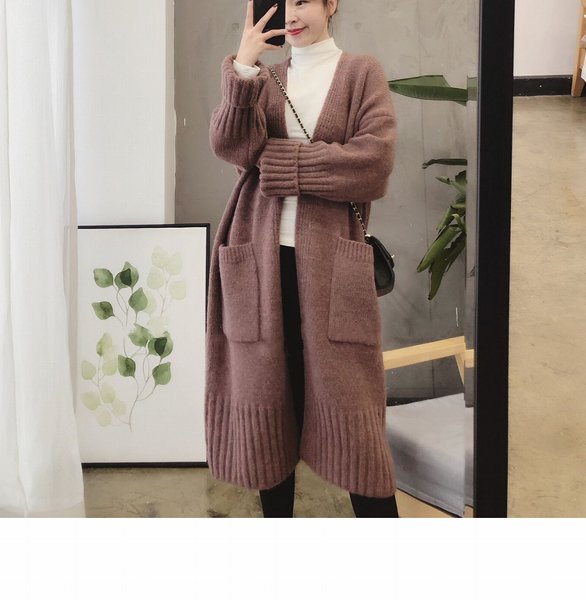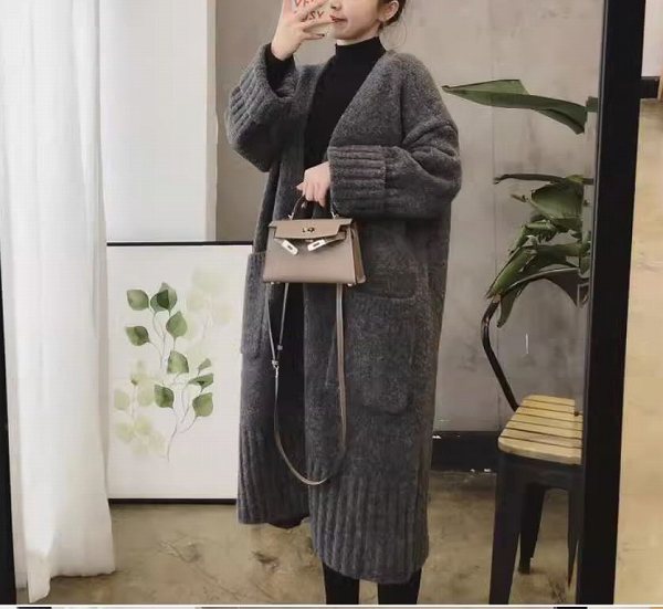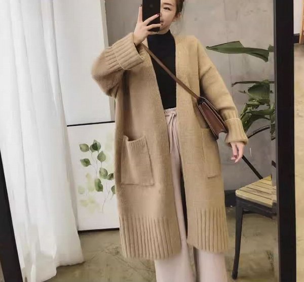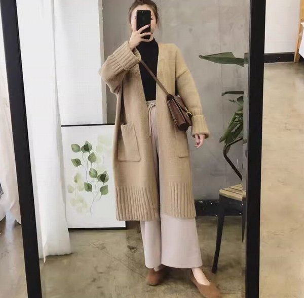 厚手のロングカーディガン ゆったり 前開き ルーズ ダブルポケット フリーサイズ グレー ベージュ
