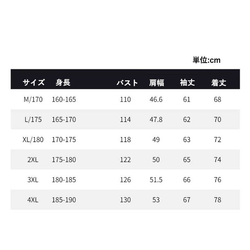 サイズ 170/M 175/L 180/XL 185/2XL 190/3XL 195/4XL