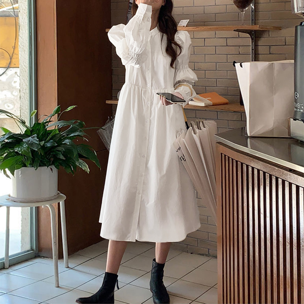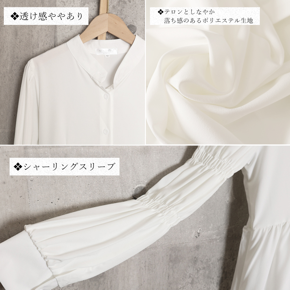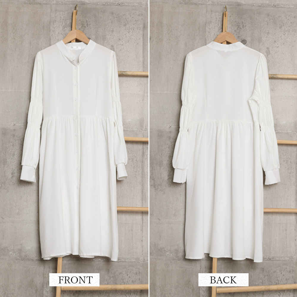 立体的でボリューミーなシャーリングスリーブは気になる二の腕をカバーしつつ、シンプルさにDESIGNの遊び心をプラスするシャツワンピース
