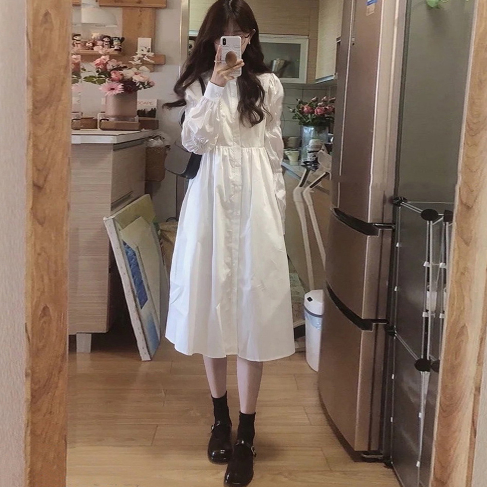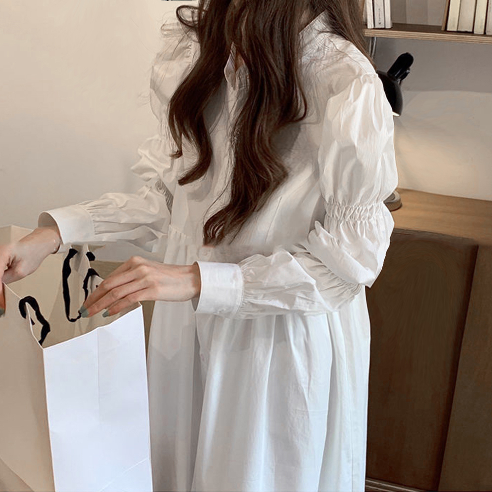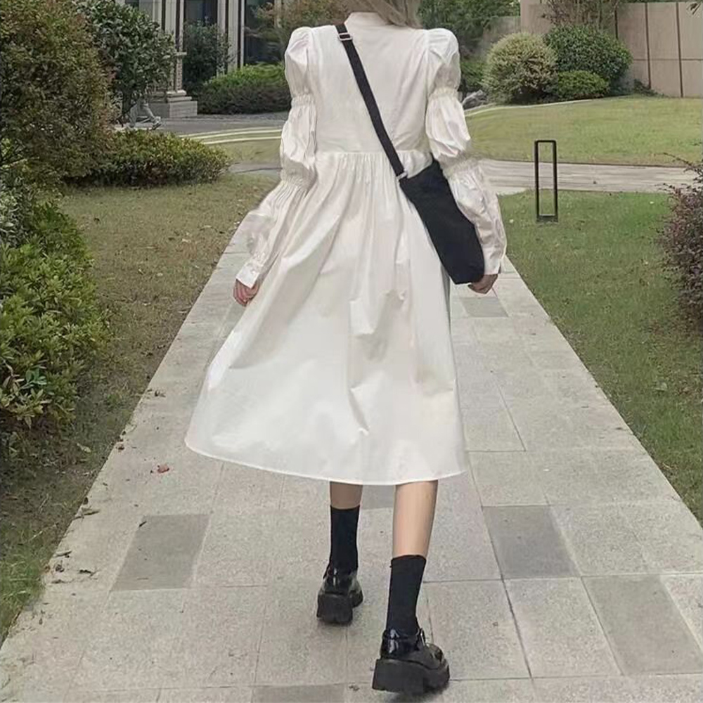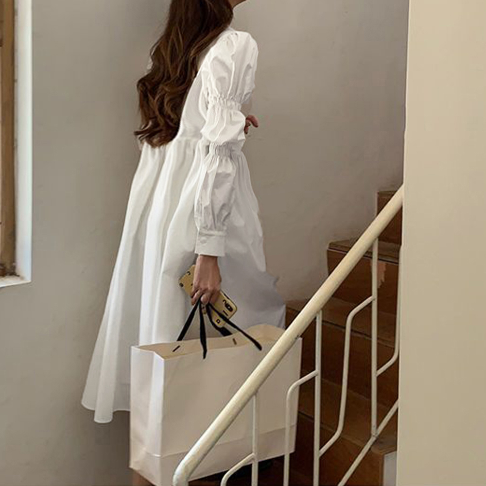 立体的でボリューミーなシャーリングスリーブは気になる二の腕をカバーしつつ、シンプルさにDESIGNの遊び心をプラスするシャツワンピース