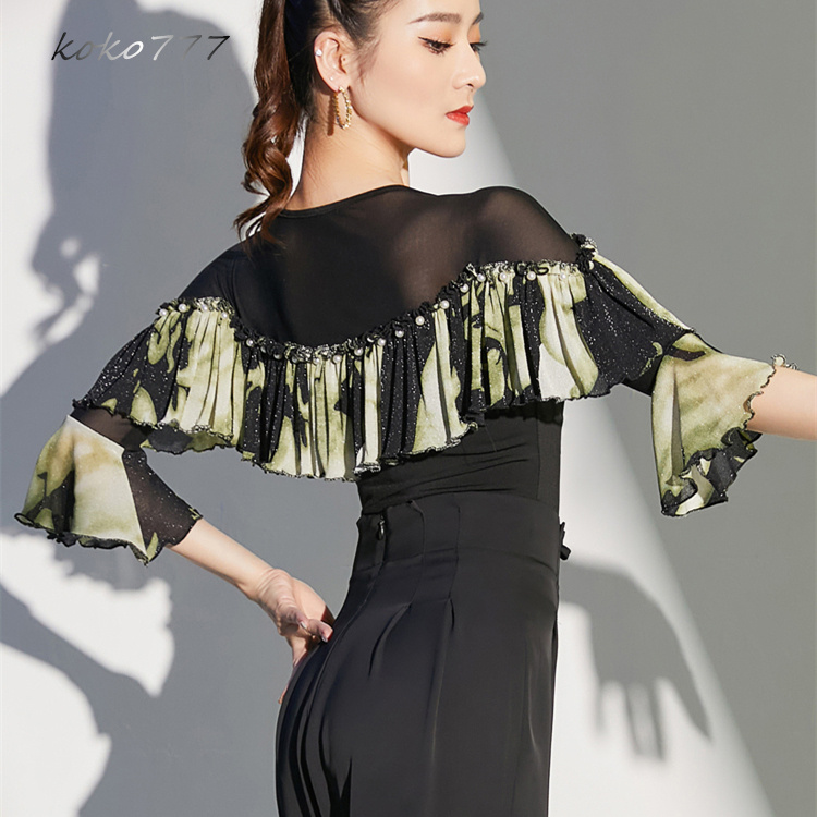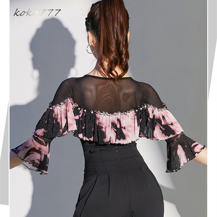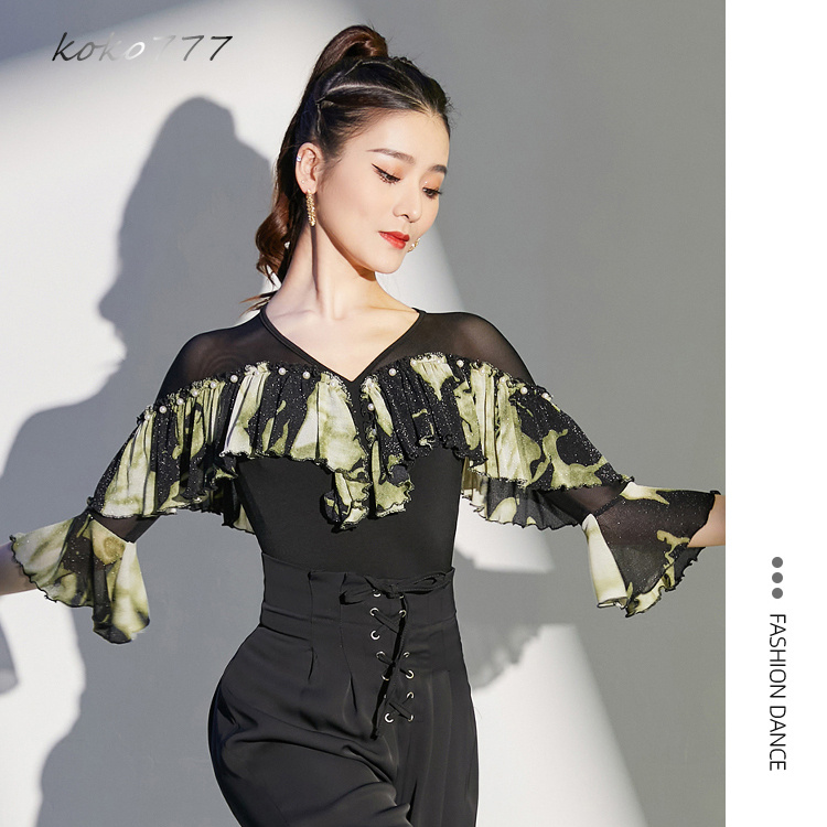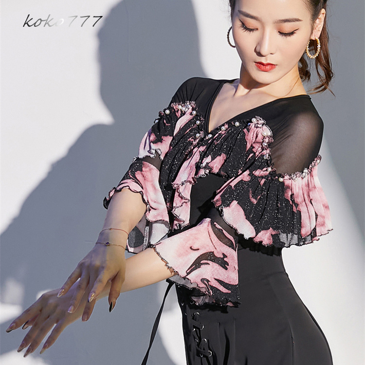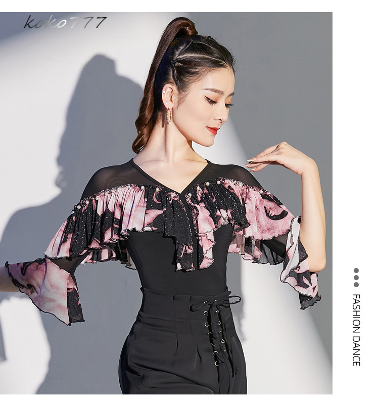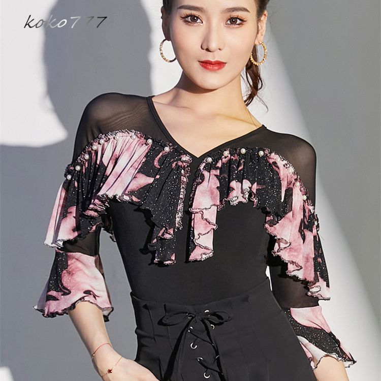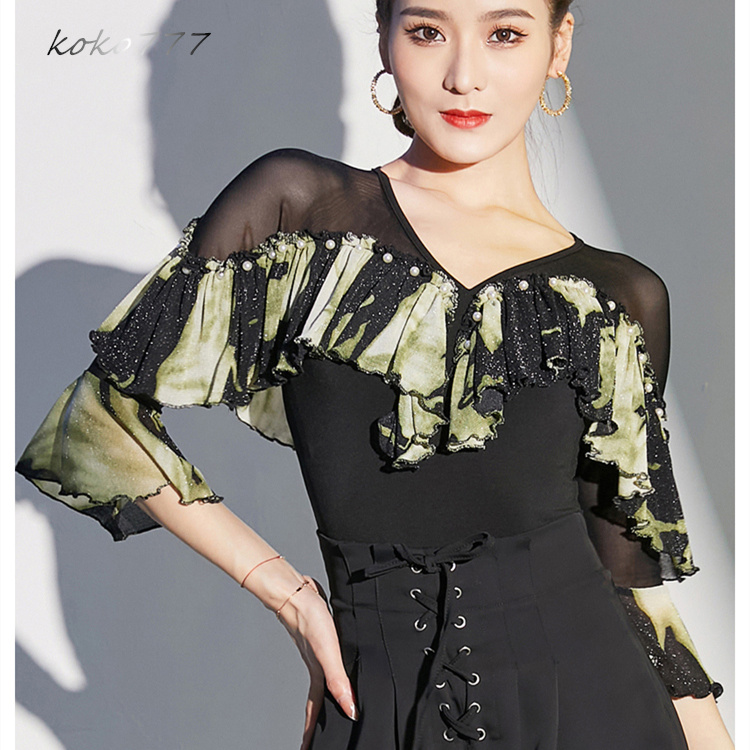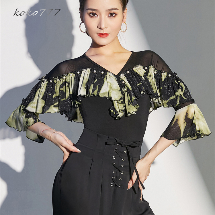 Tシャツ レディース レオタード 上衣 Vネック ラテンダンス 練習着 フリル 学園祭 舞台衣装 部活公演 トップス モダンダンス 発表会 ロンパース 女子服 ウェア