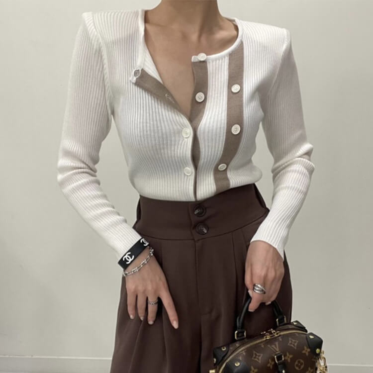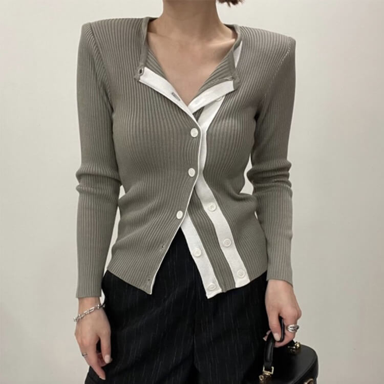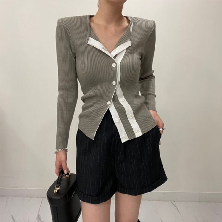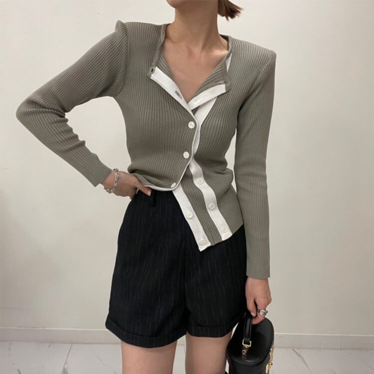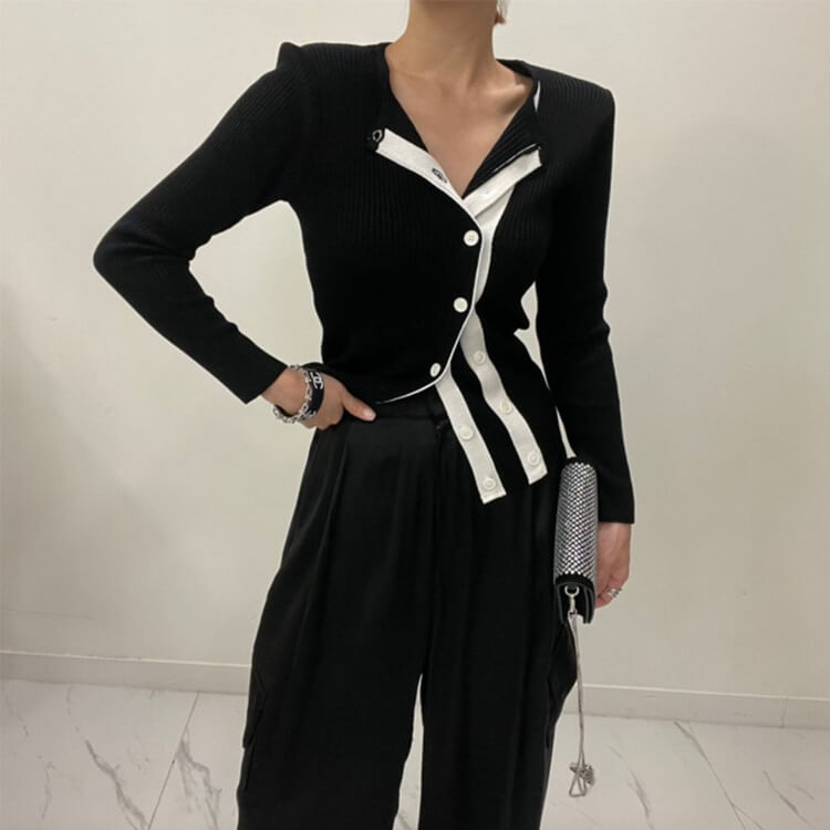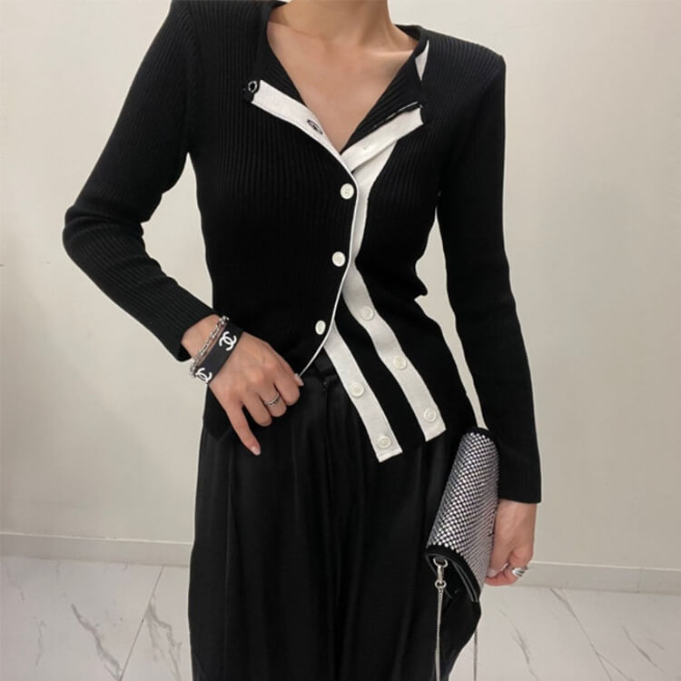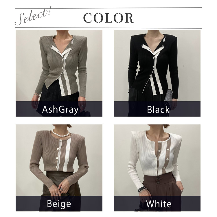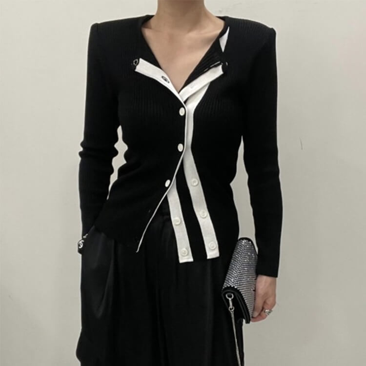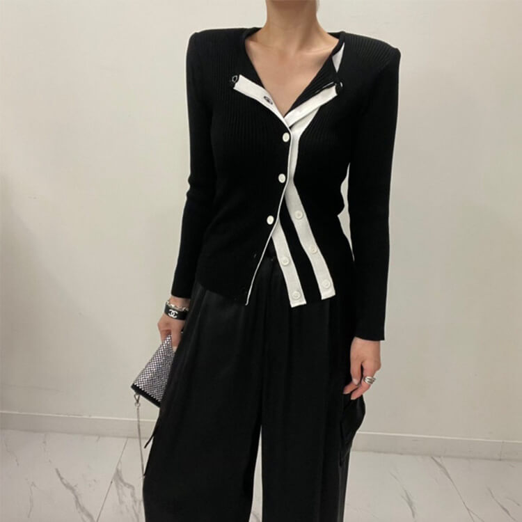 韓国デザインのバイカラーラインのアシンメトリーニットカーディガン。