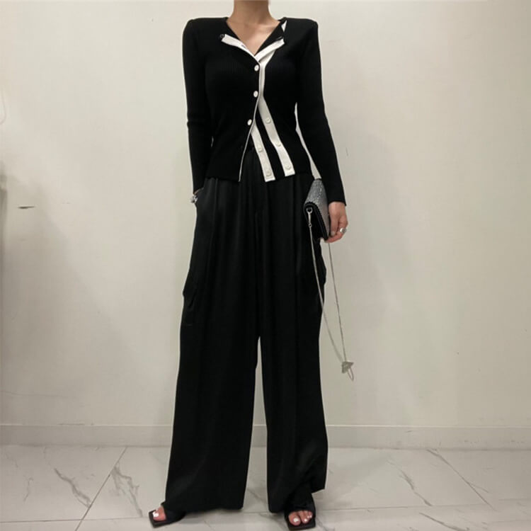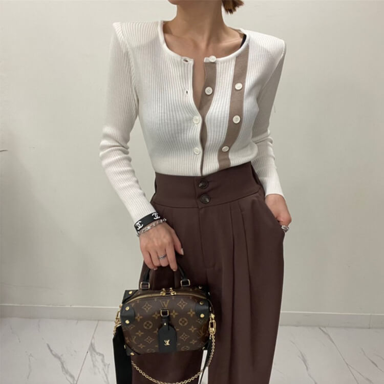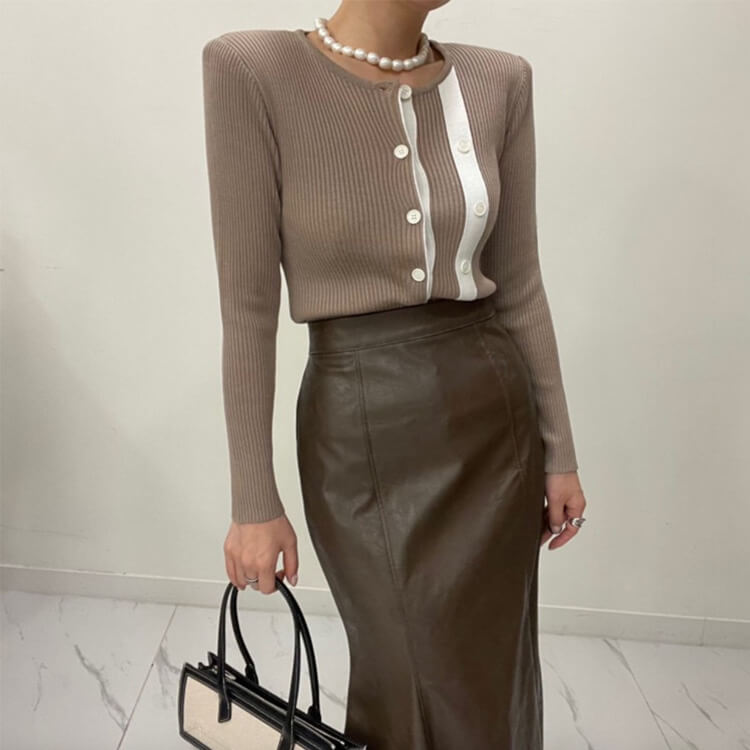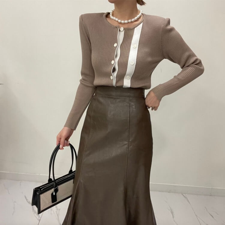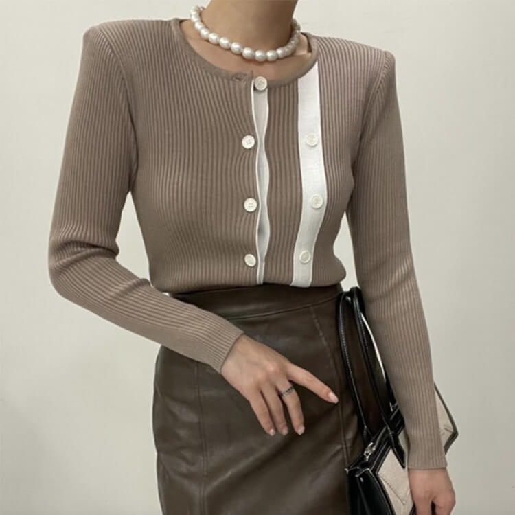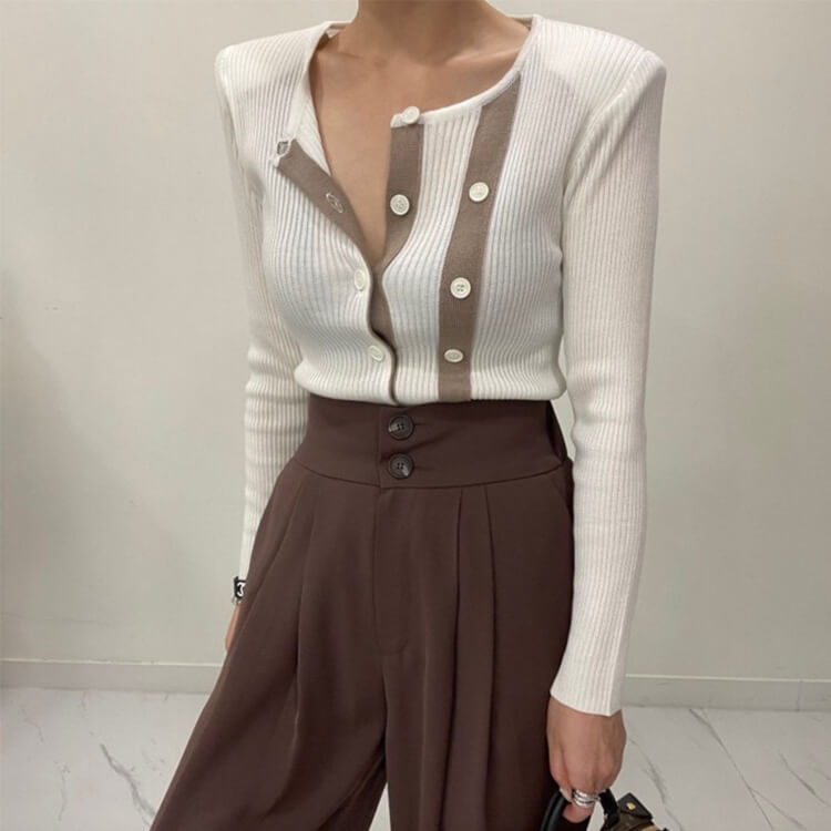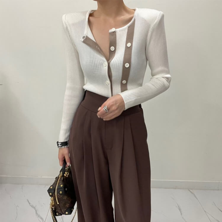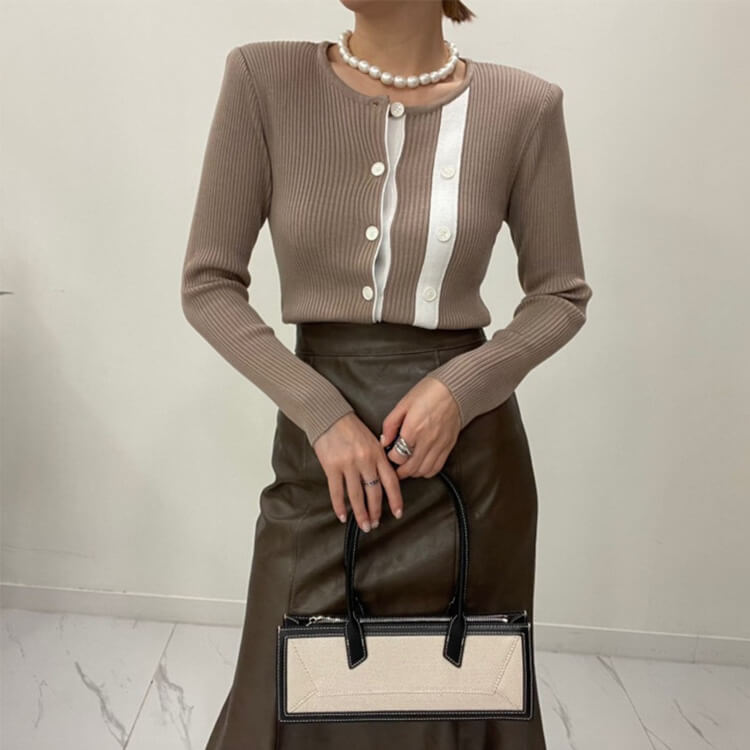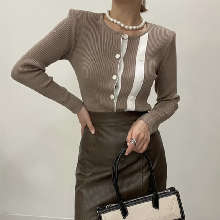 韓国デザインのバイカラーラインのアシンメトリーニットカーディガン。