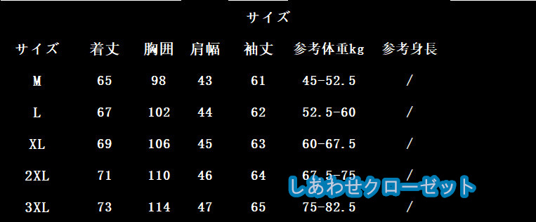 サイズ M(参考体重42.5-50KG) L(参考体重50-57.5KG) XL(参考体重57.5-65KG) 2XL(参考体重65-72.5KG) 3XL(参考体重72.5-80KG)