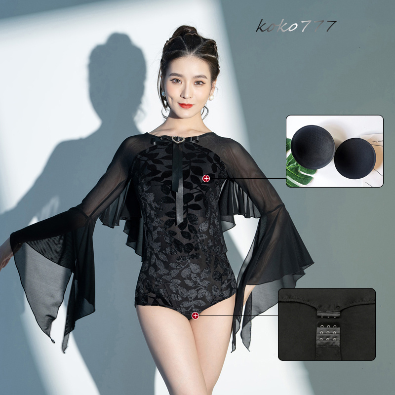 Tシャツ レディース レオタード 上衣 リボン ラテンダンス 発表会 ウェア 公演 ロンパース 女子服 部活 モダンダンス フレア袖 学園祭 柄物 練習着 舞台衣装
