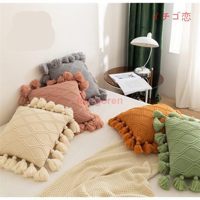クッションカバー 北欧 フリンジ付き 45X45CM 可愛い ソファ背当て 高級感 タッセル 装飾枕カバー ファッション 編み 座布団カバー ニット