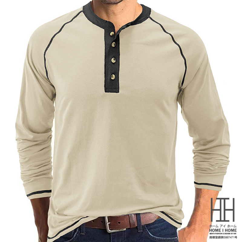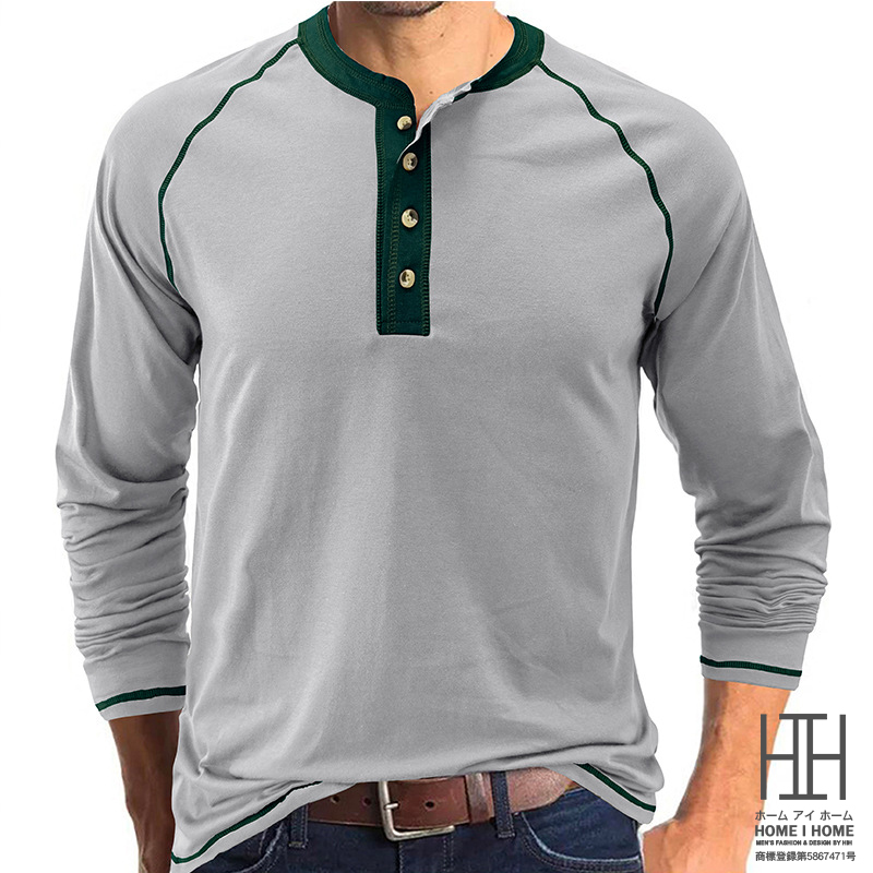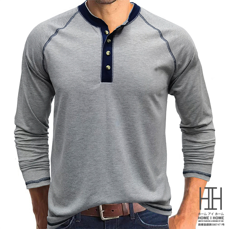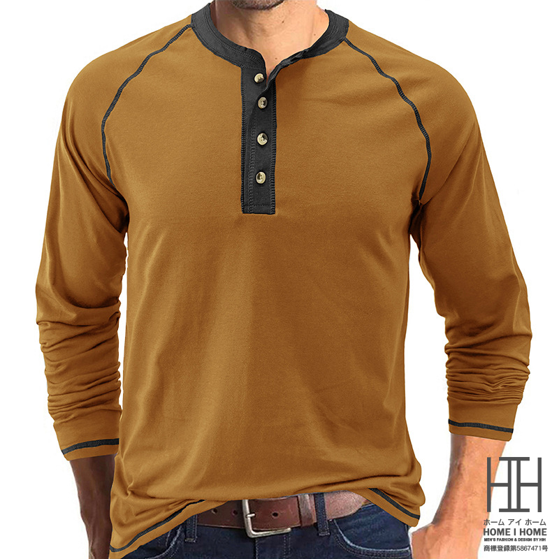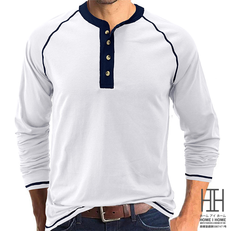 Tシャツ メンズ 長袖 ヘンリーネック ストレッチ おもしろTシャツ カラー配色 切り替え おしゃれ 個性 ロンT バンドTシャツ ゆったり アメカジ