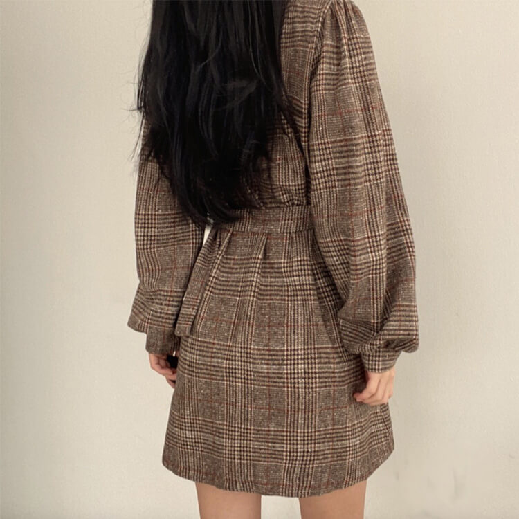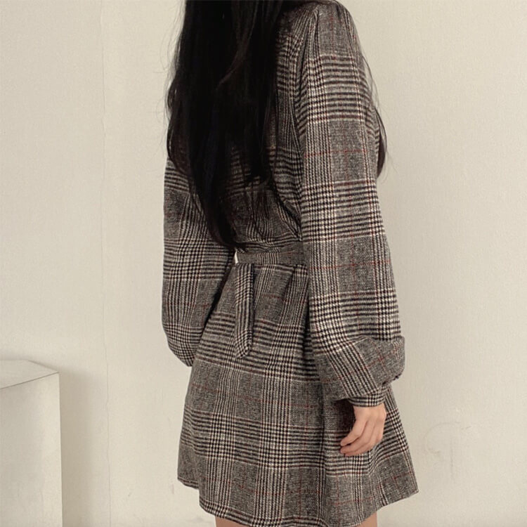 韓国デザインのレトロなグレンチェック柄ショート丈フロントボタンミニワンピース。