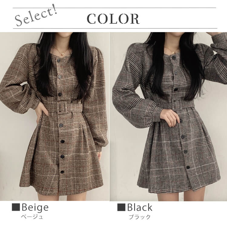 ワンピース レディース ミニ 長袖 韓国 チェック柄 ショート丈 レトロ グレンチェック シック ウエストマーク パフスリーブ ミニワンピース