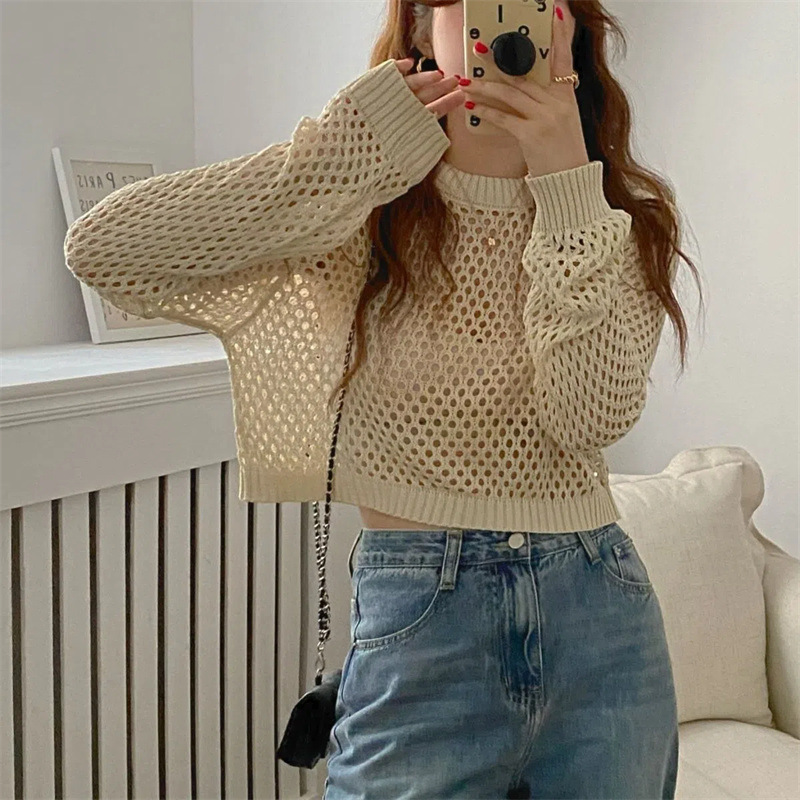 サマーニット 透かし編み 冷房対策 レディース UVカット クルーネック 長袖 体型カバー ゆったり お洒落 可愛い トップス トレンド カジュアル