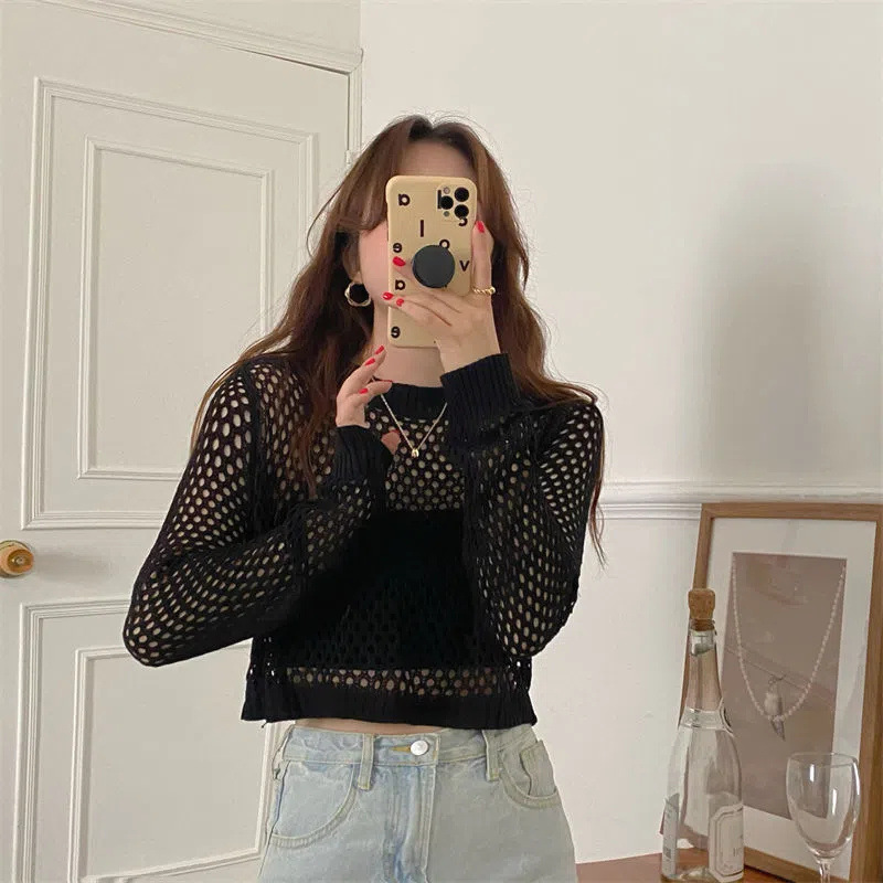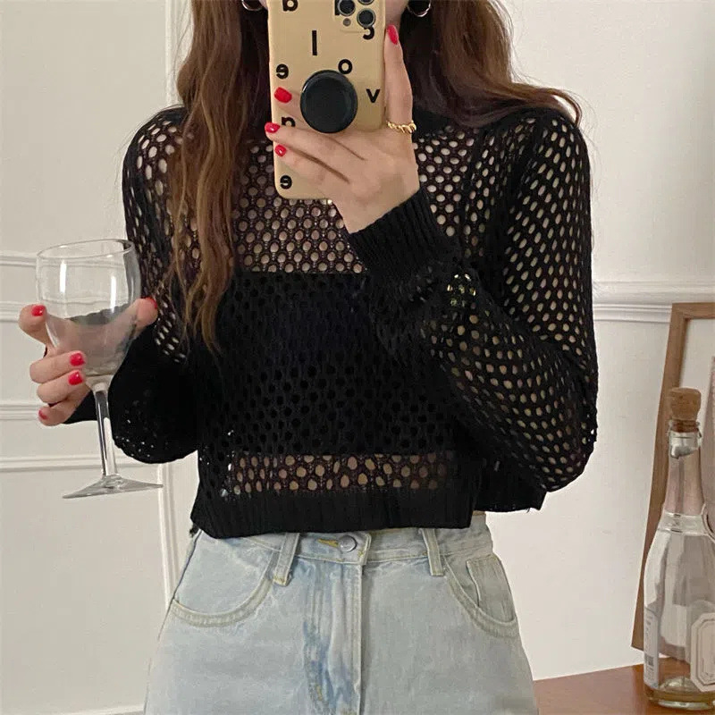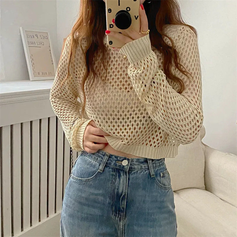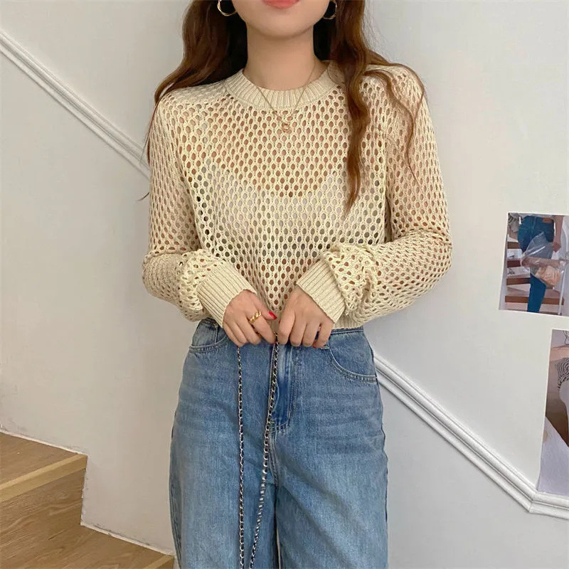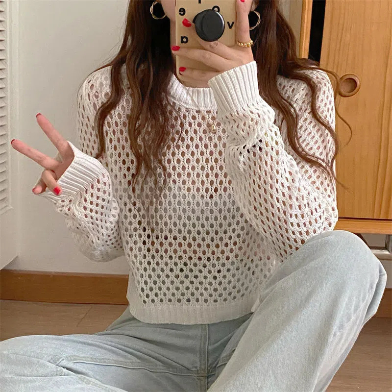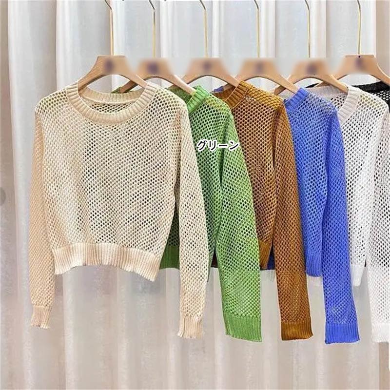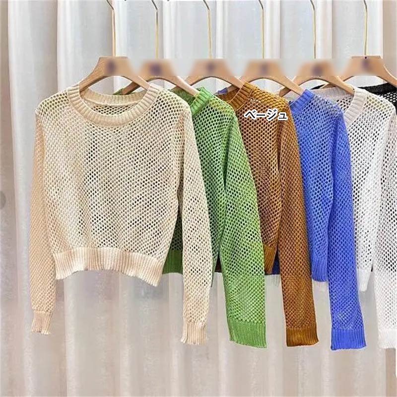商品名:サマーニット 透かし編み 冷房対策 レディース UVカット クルーネック トレンド 長袖 ゆったり 体型カバー お洒落 可愛い カジュアル トップス 春秋