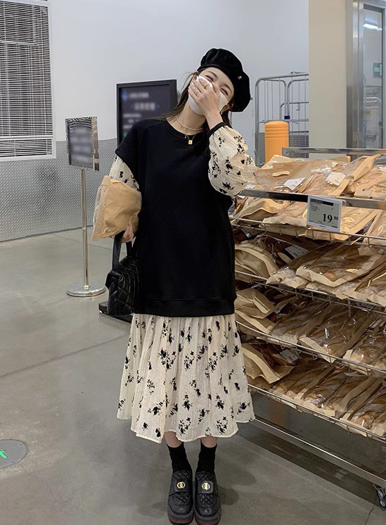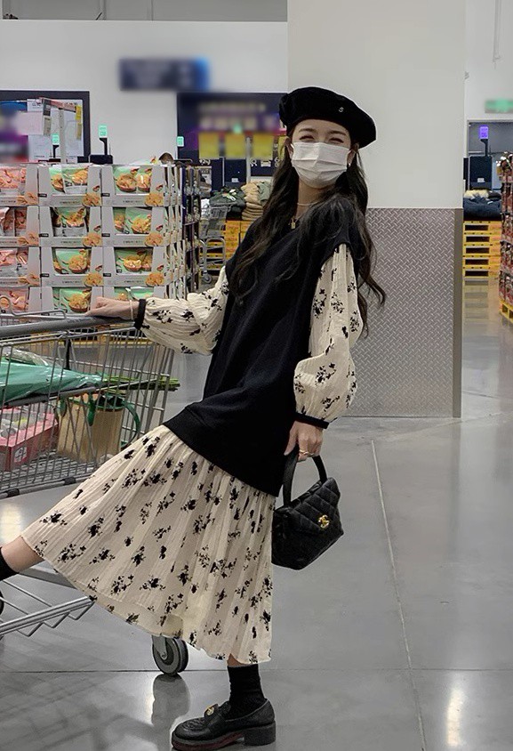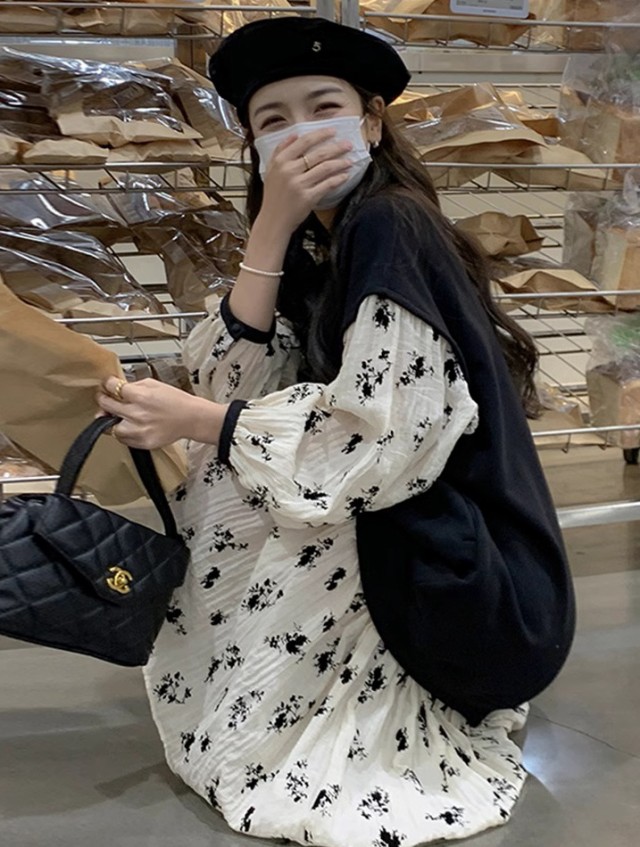 レイヤード風ワンピース レディース ワンピース 長袖 ロング 花柄 フレア 重ね着風ワンピース ニット ベスト 秋冬 大きいサイズ 3L 韓国 ファッション