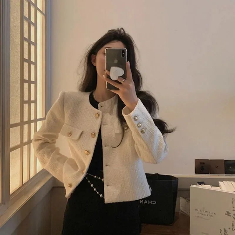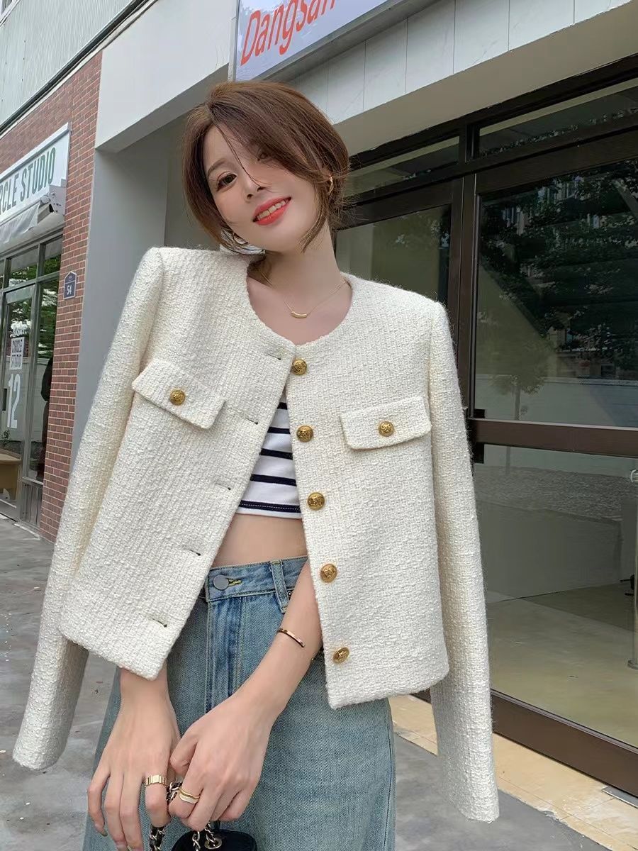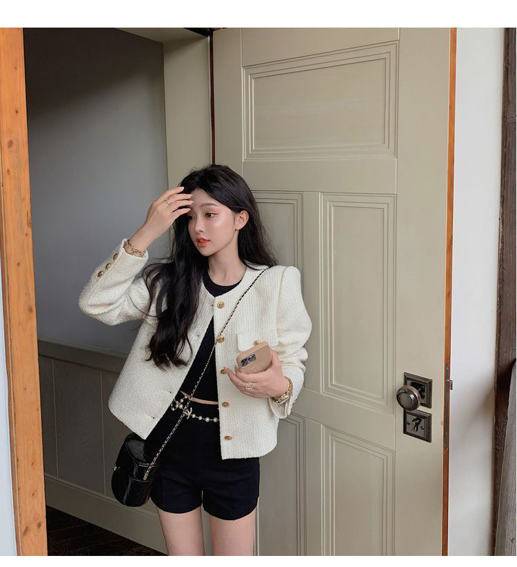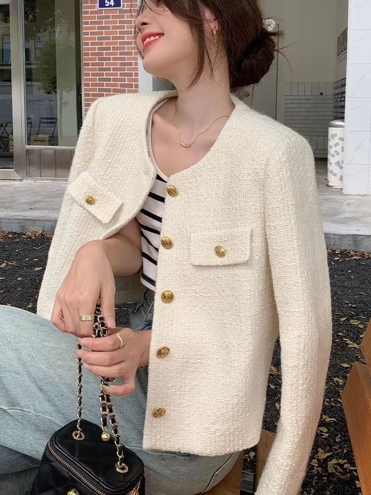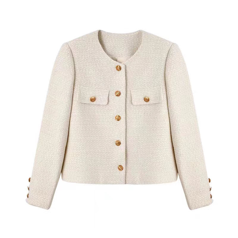 商品説明:ツイードジャケット ノーカラー ショート丈 エレガント アウター