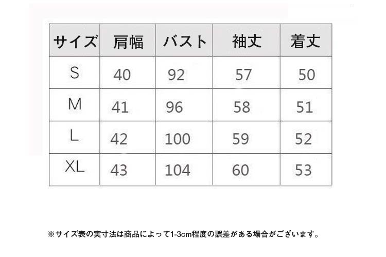 サイズについての説明:サイズ 肩幅 バスト 袖丈 着丈※サイズ表の実寸法は商品によって1-3CM程度の誤差がある場合がございます。