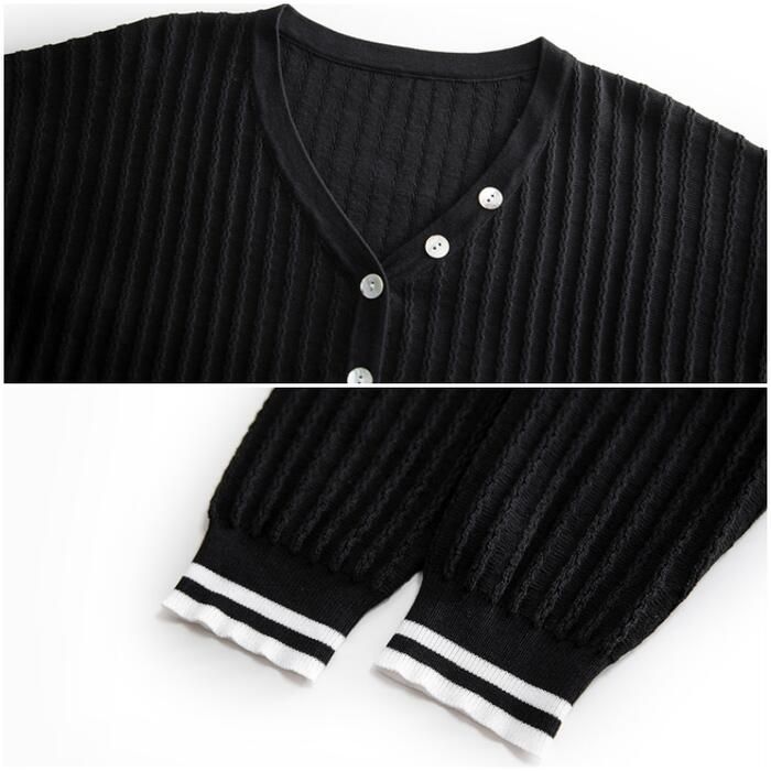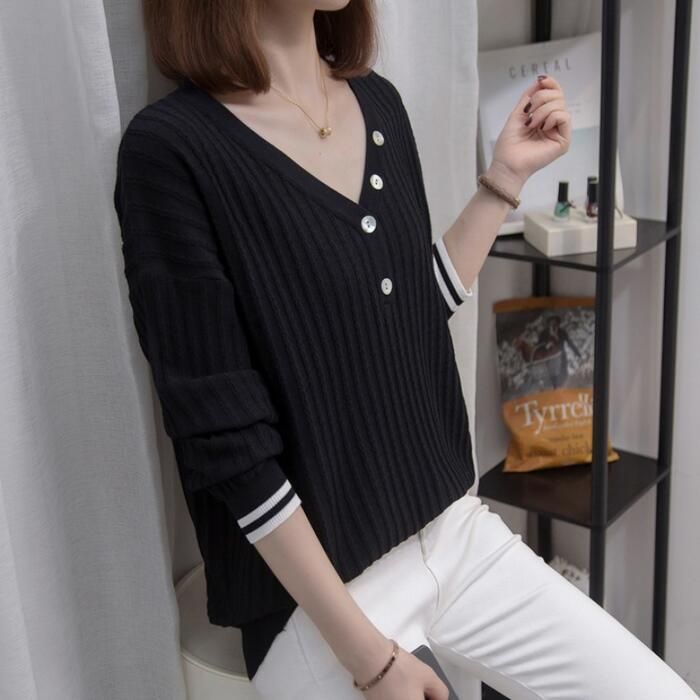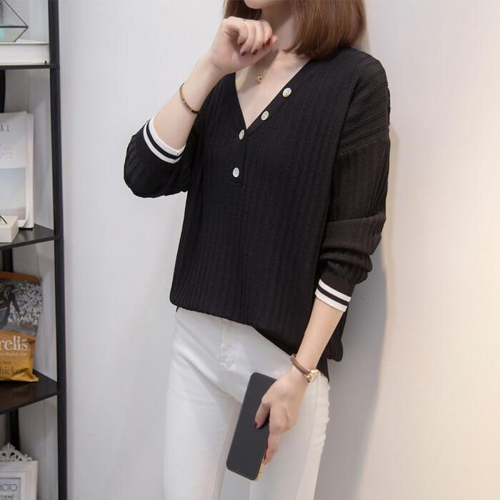 トップス ニット カットソー レディース きれいめ エレカジュアル 可愛い 大人 Vネック 通勤 シンプル 大 おしゃれ 配色 長袖 ライン フェミニン ボタン