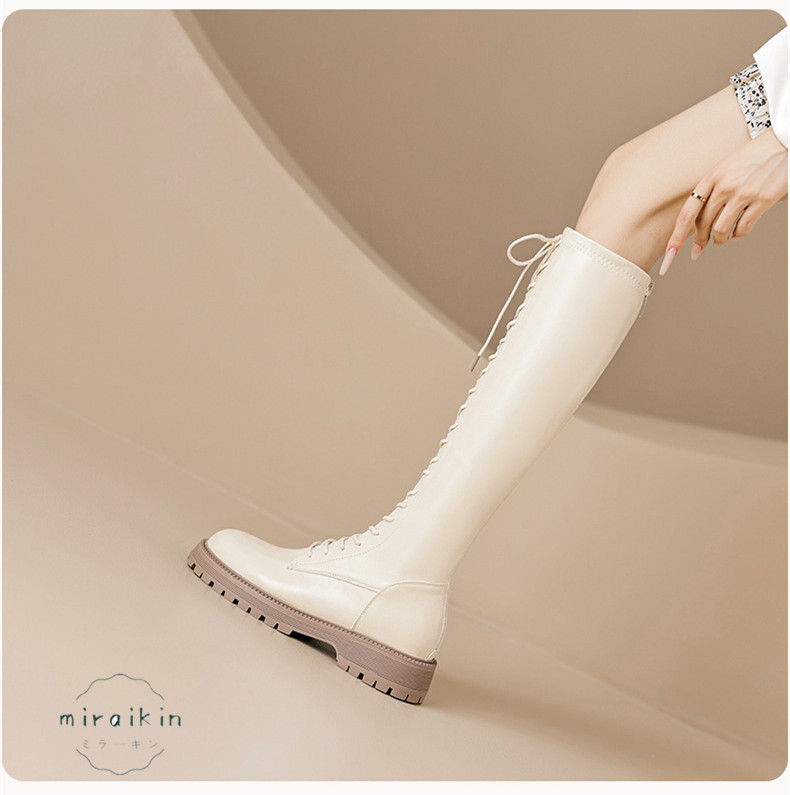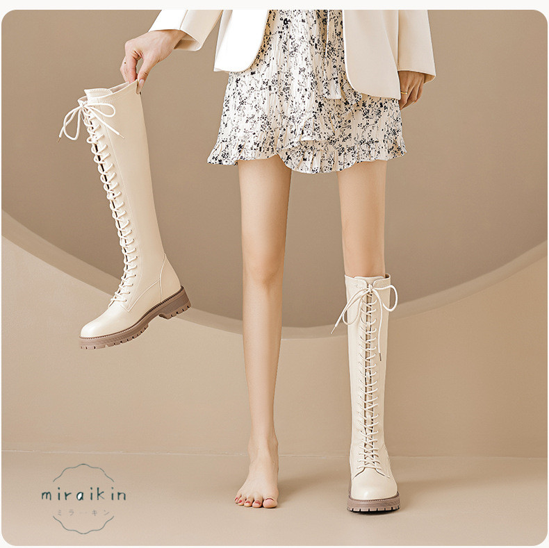 韓国 厚底ロングブーツ 秋冬シューズ 編み上げブーツ 美脚 バックジップローヒール靴 おしゃれ 疲れにくい