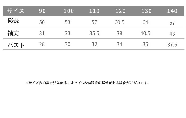 サイズについての説明:サイズ 総長 袖丈 バスト※サイズ表の実寸法は商品によって1-3CM程度の誤差がある場合がございます。