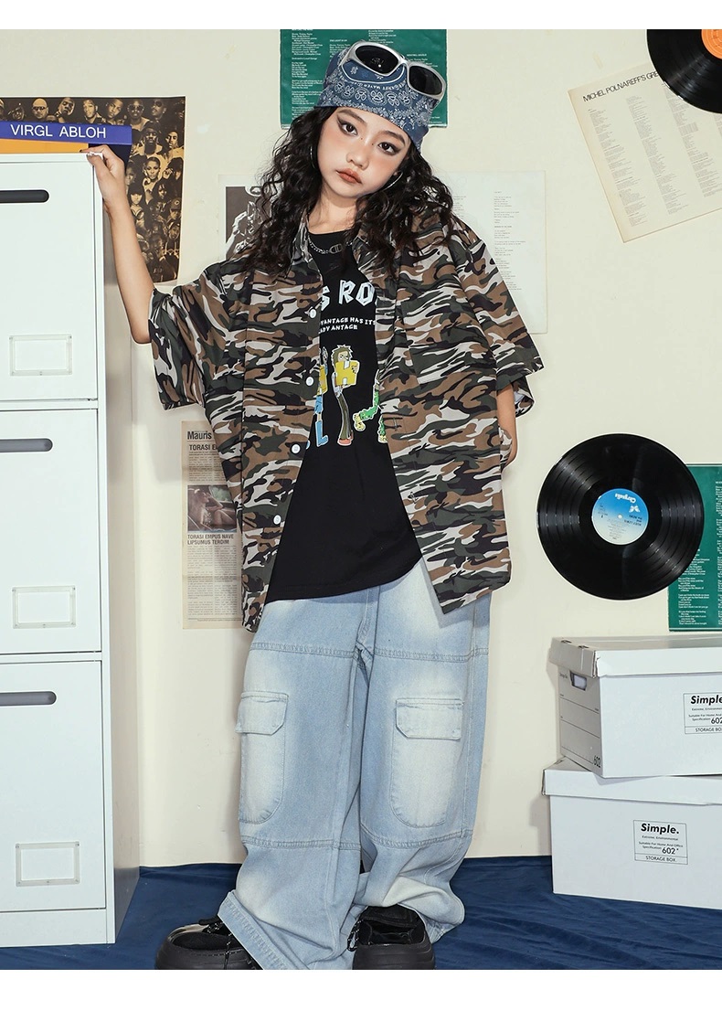 キッズダンス ヒップホップ HIPHOP HIP HOP K-POP 韓国 ガールズヒップホップ ダンスコンテスト ダンス発表会 子供衣装 子供ダンス衣装 子供ダンス服 ダンスウェア ファッション 半袖 かっこいい カッコいい おしゃれ 男の子 女の子 ジュニア レディース 大人 派手 目立つ 110 120 130 140 150 160 170 180 総柄 カモフラージュ