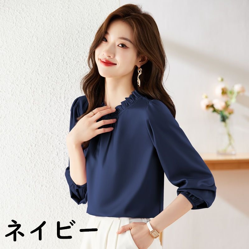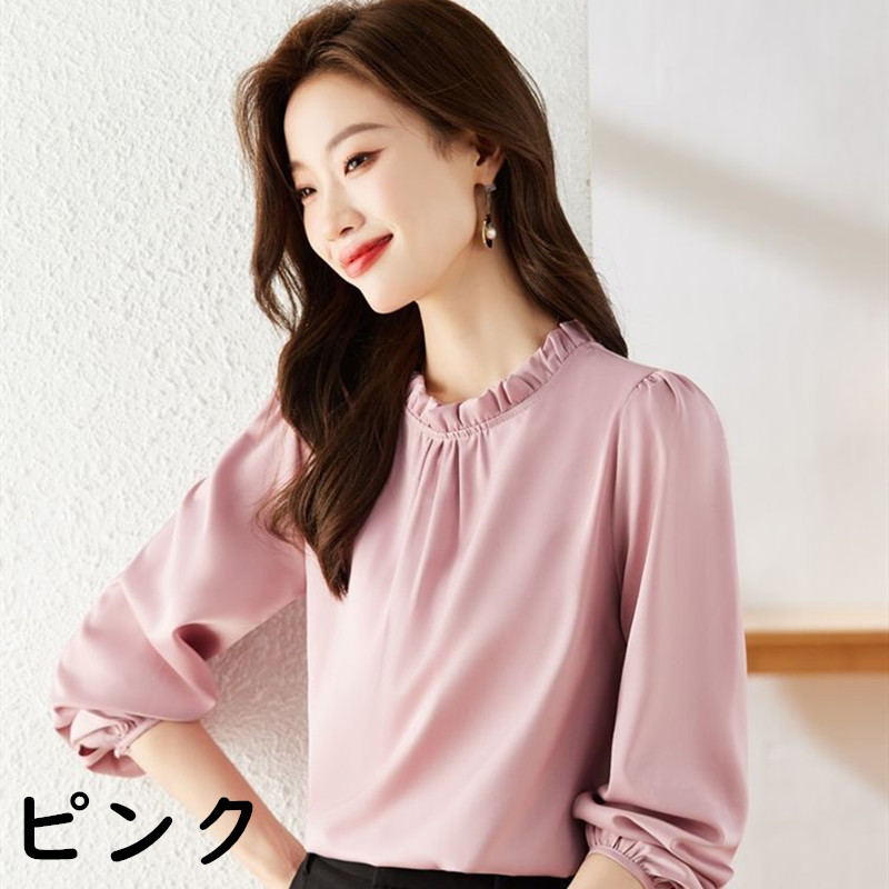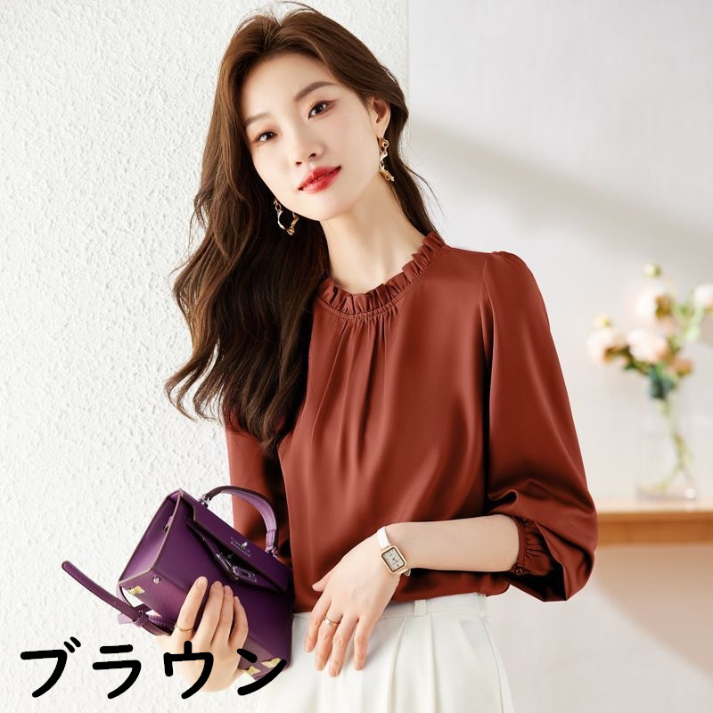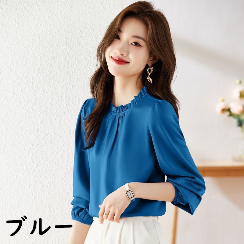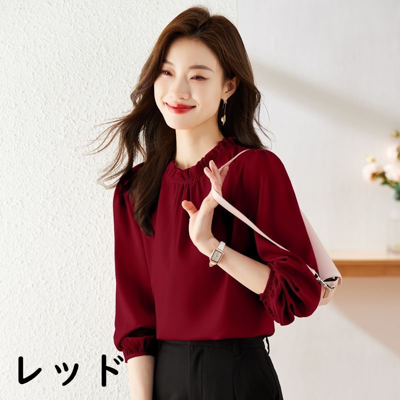 お取り寄せ商品 ブラウス レディース シャツ 長袖 6COLORS M-3XL 小さめ クールネック フレアネックデザイン パフスリーブ 無地 シンプル おしゃれ ファッション エレガント