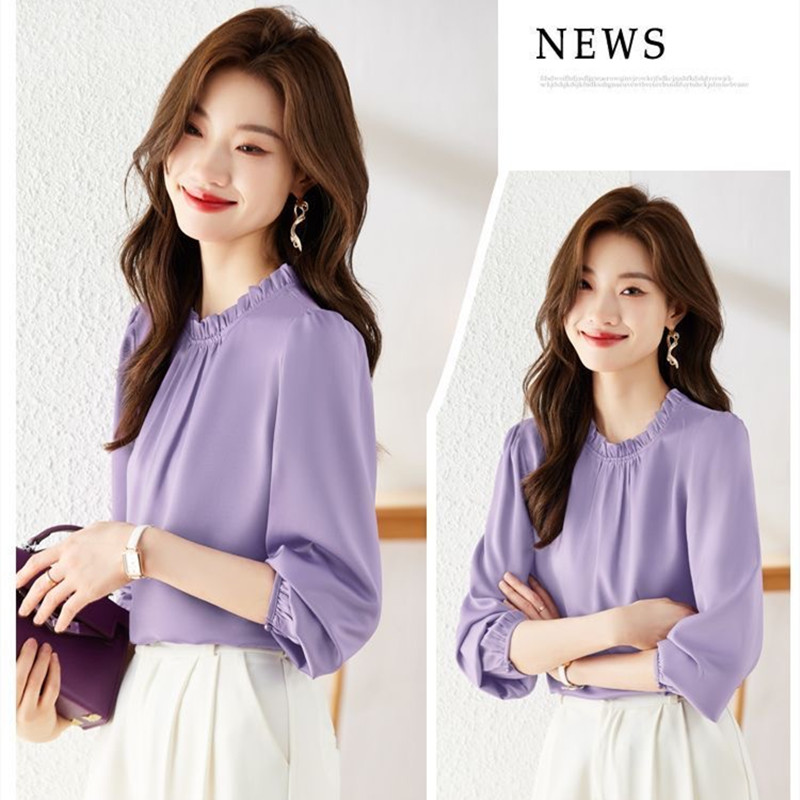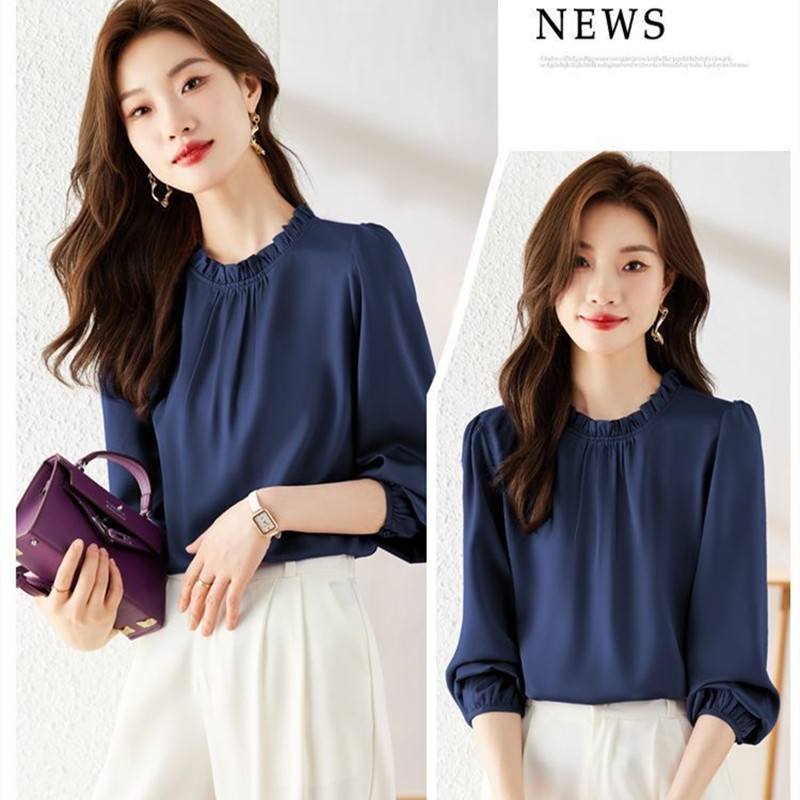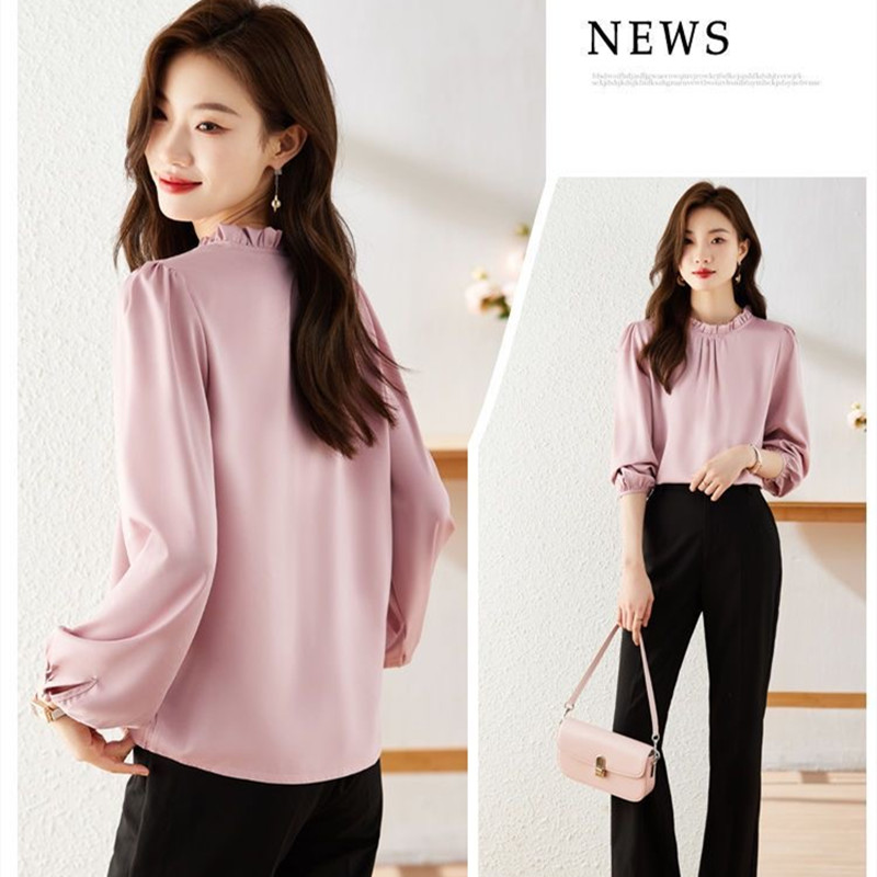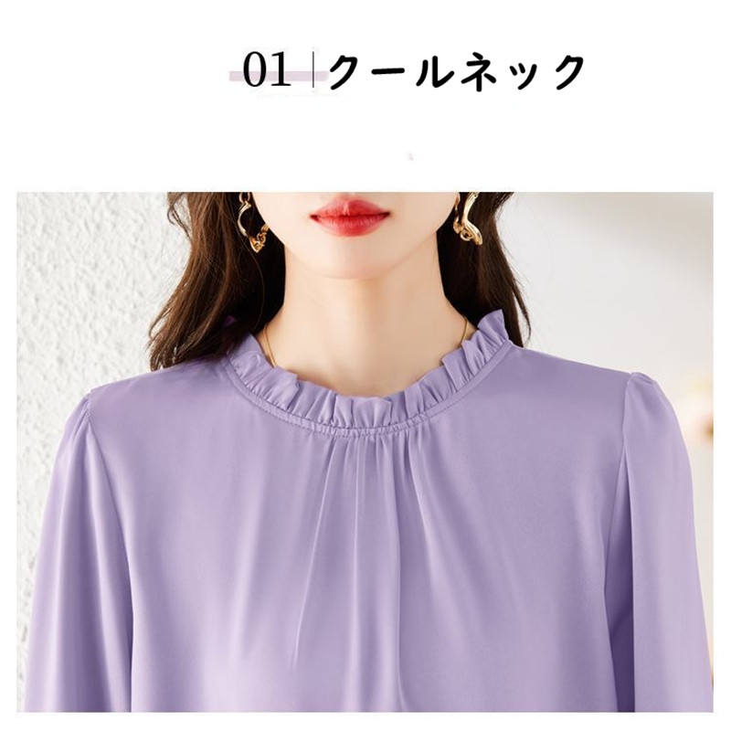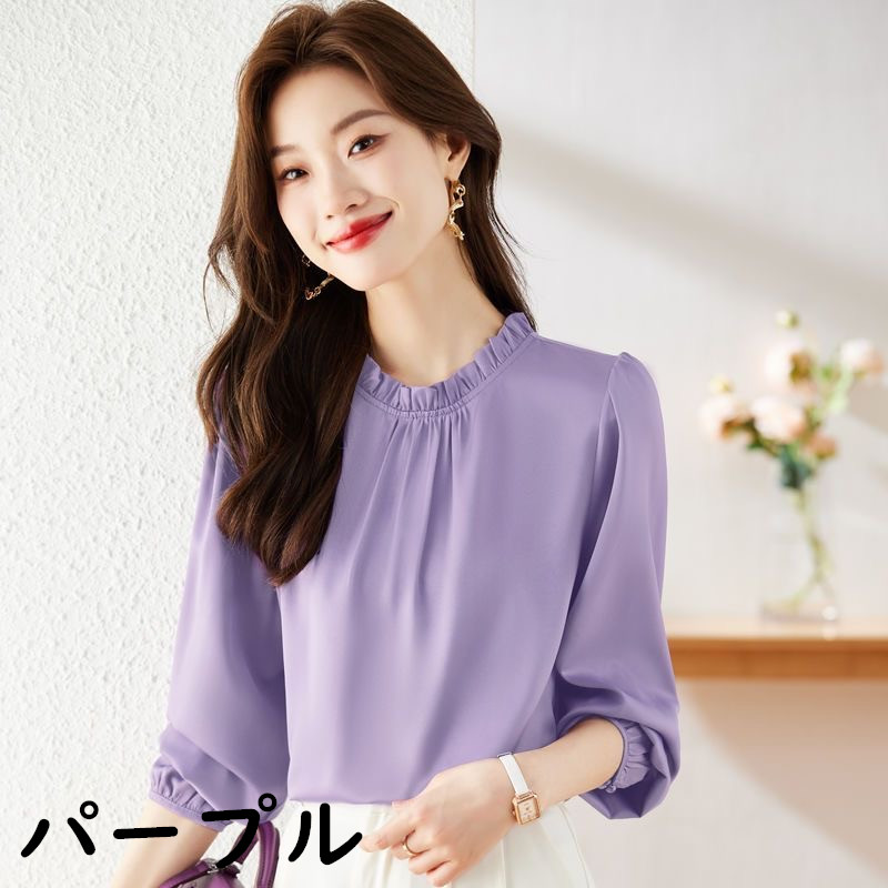 お取り寄せ商品 ブラウス レディース シャツ 長袖 6COLORS M-3XL 小さめ クールネック フレアネックデザイン パフスリーブ 無地 シンプル おしゃれ ファッション エレガント