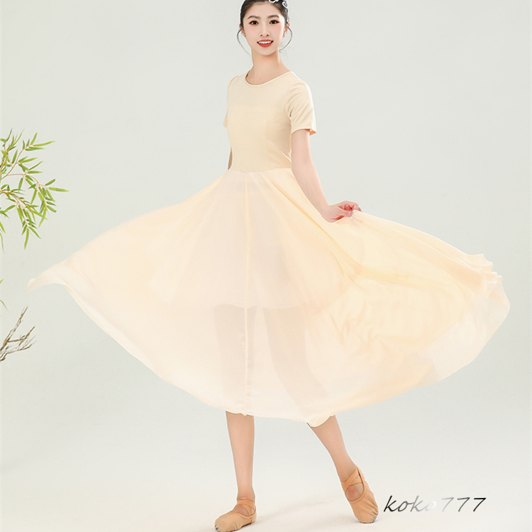 ワンピース レディース ロングドレス ダンスウエア 半袖 踊り 練習着 発表会 無地 ライブ 舞台衣装 コスチューム シフォン 部活 モダンダンス 女子服