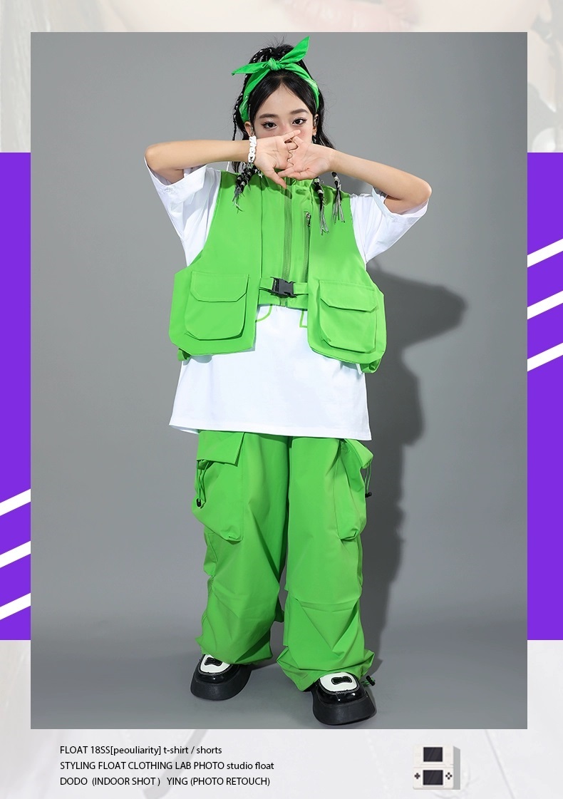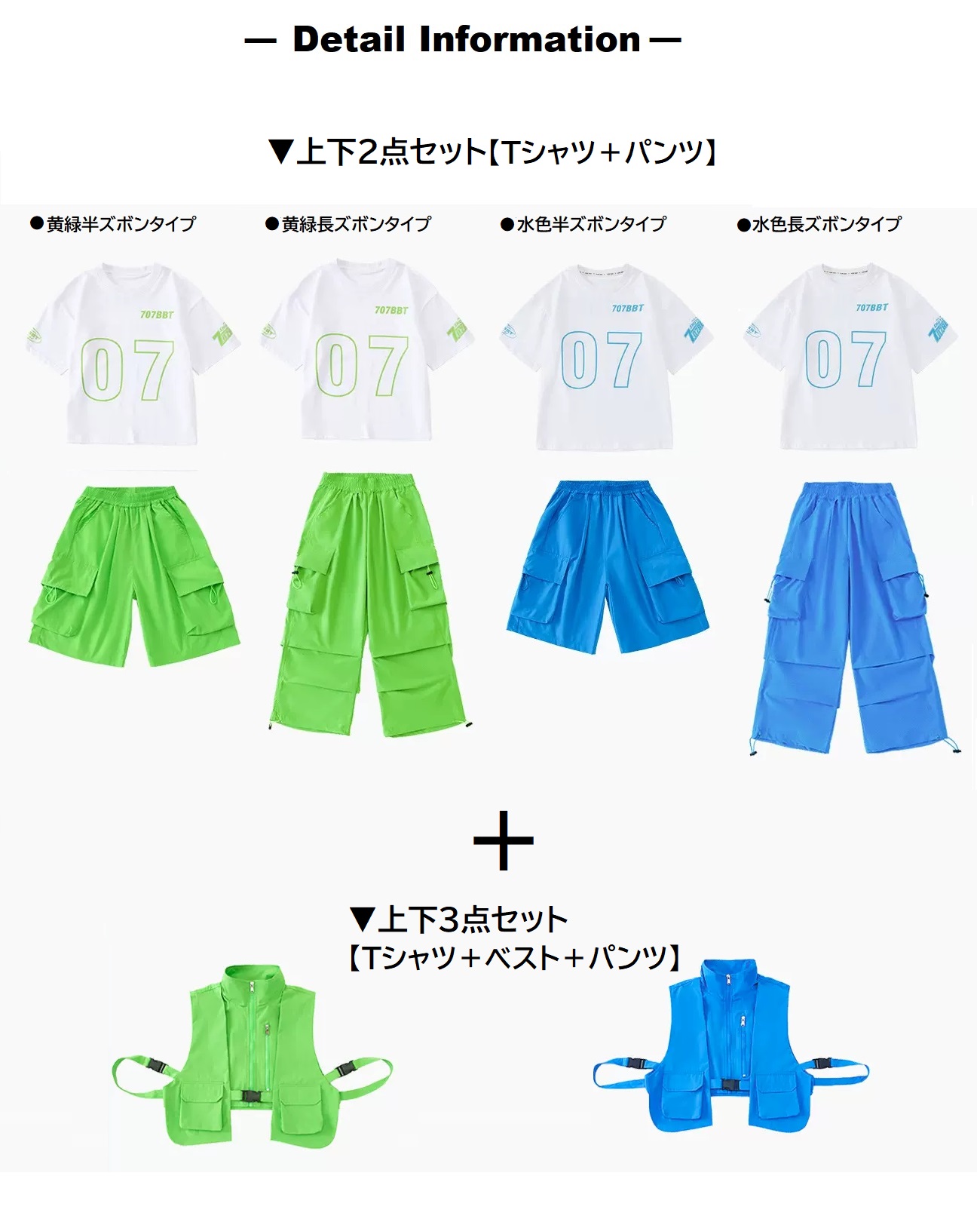 キッズダンス ヒップホップ HIPHOP HIP HOP K-POP 韓国 ガールズ ダンスコンテスト ダンス発表会 ダンス練習着 ダンスレッスン着 子供ダンス衣装 子供衣装 子供ダンス服 ダンスウェア 目立つ 派手 かっこいい おしゃれ オシャレ ダンスファッション セットアップ 上下セット フィッシングベスト パラシュートカーゴパンツ 男の子 女の子 ジュニア 110 120 130 140 150 160 170 180 白 水色 黄緑
