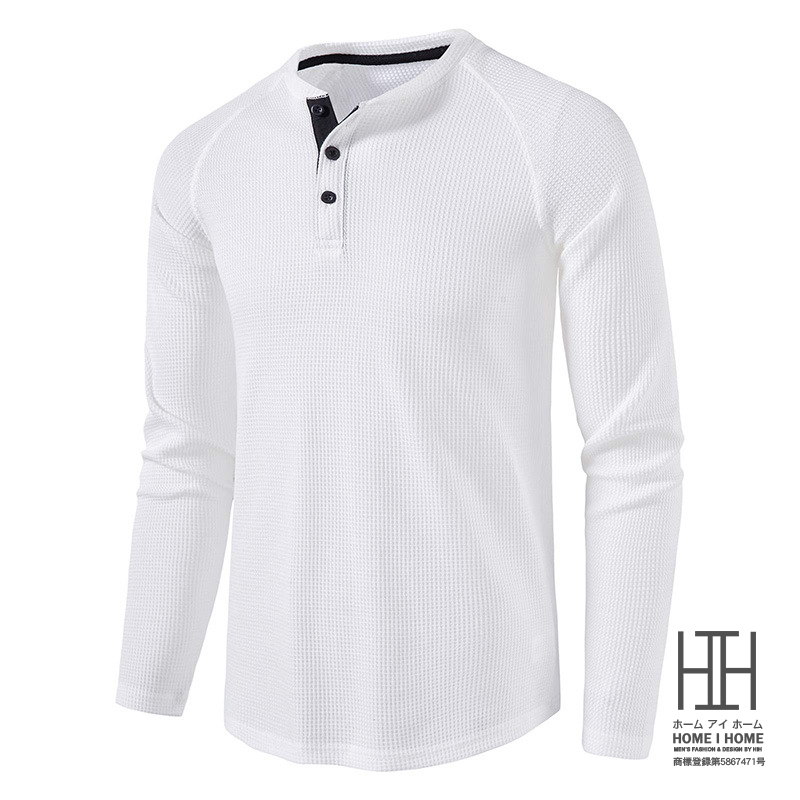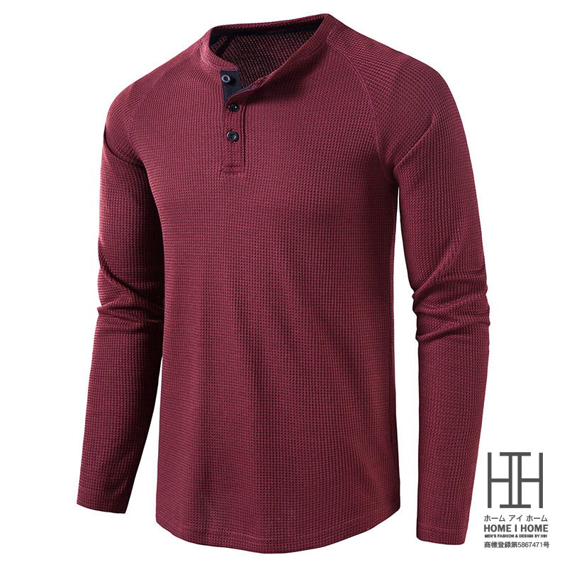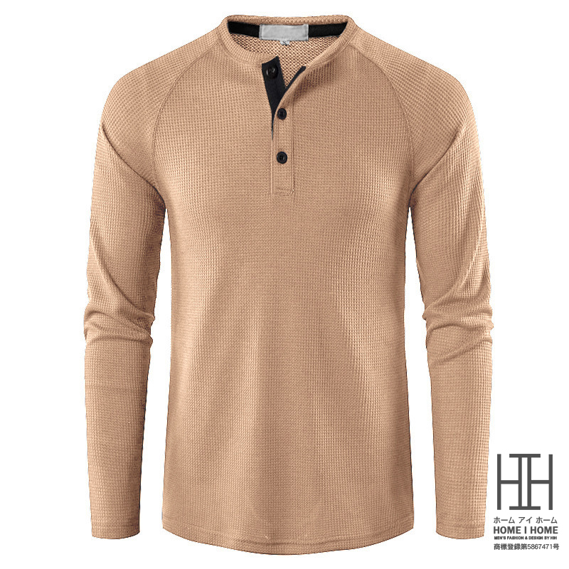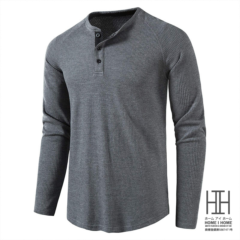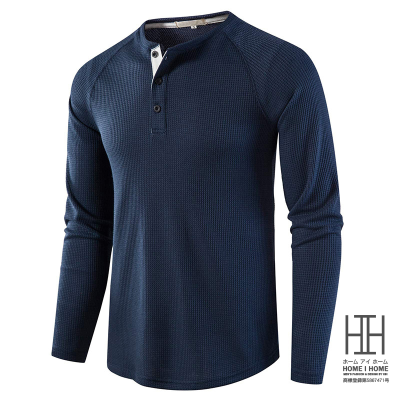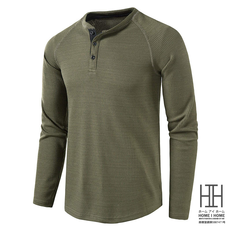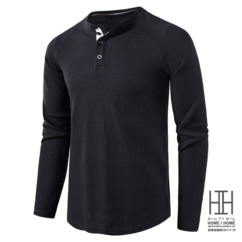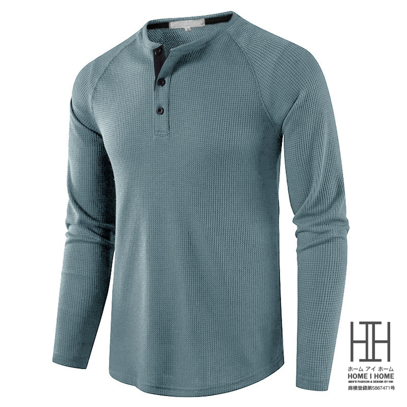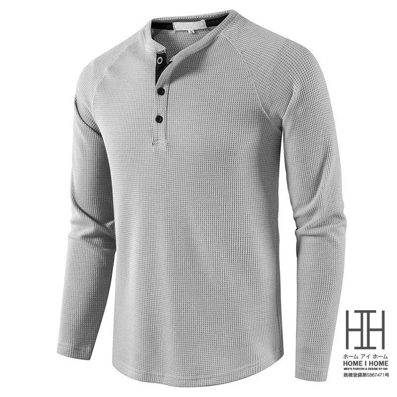 定番のワッフル生地ヘンリーネック長袖Tシャツ。