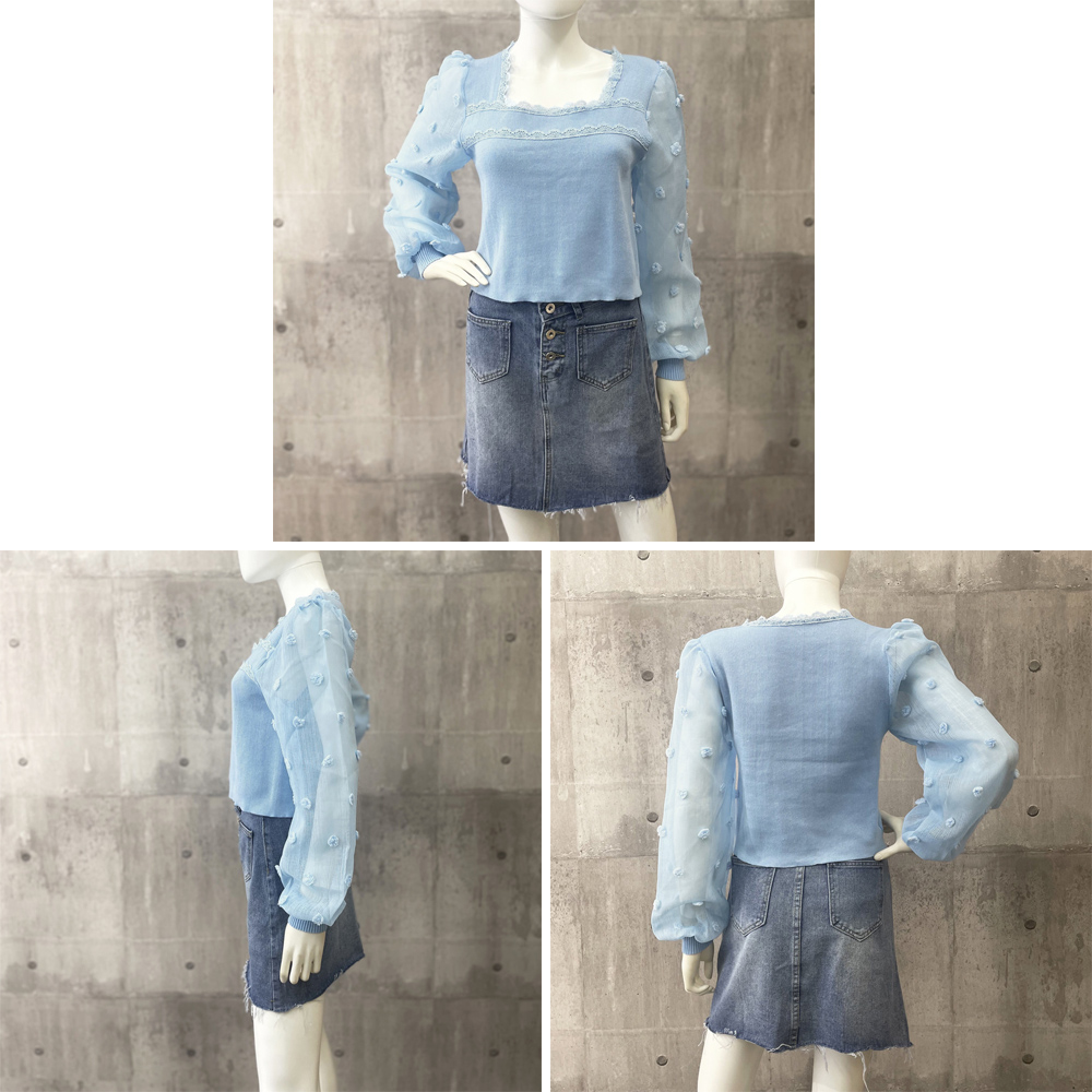 袖部分の異素材デザインは、トレンド感のあるスタイルを演出するスクエアネックニットトップス