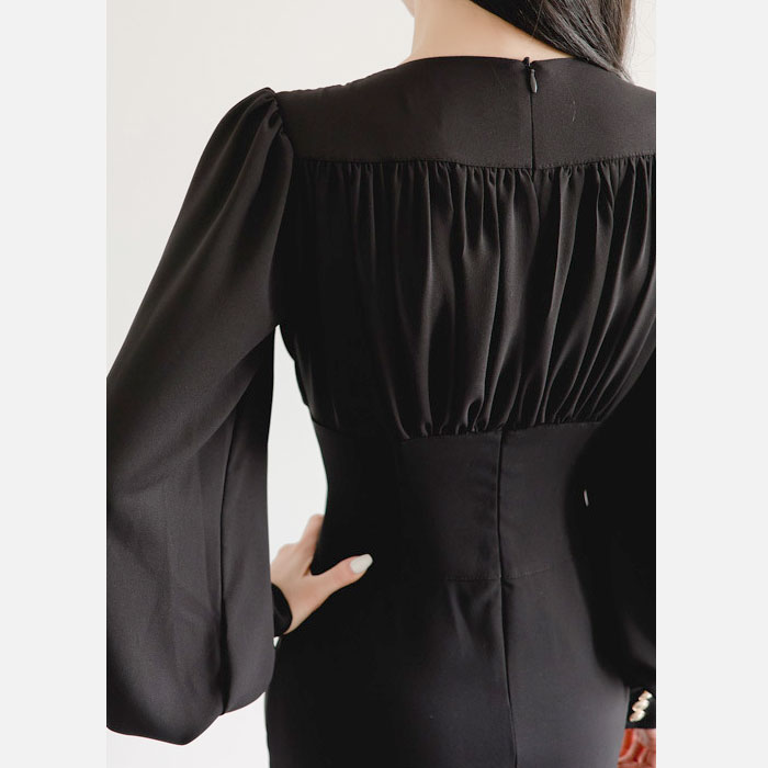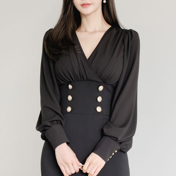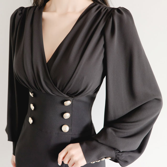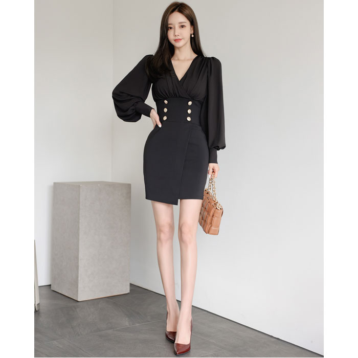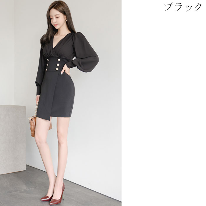 スラッとしたタイト気味シルエットに、カシュクールVネック胸元がエレガントなセクシーさを醸し出す、ショート丈の長袖ワンピースです。 シックで大人スタイルな白色と黒色のカラーにタイトミニスカートシルエットがラグジュアリー効果を演出。 ハイウエスト切り替え部分の2連ボタンが足長効果を生み、軽やかな袖とも合い、これ1枚で着回し可能なワンピです。