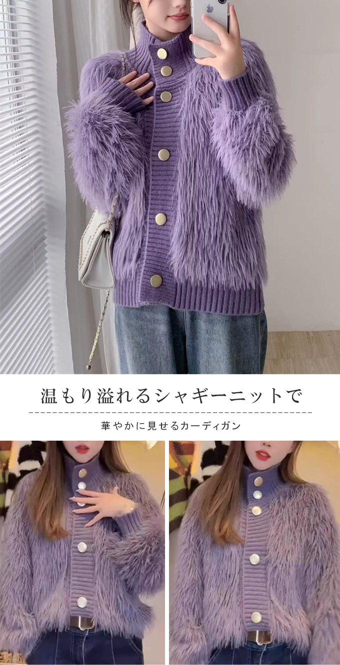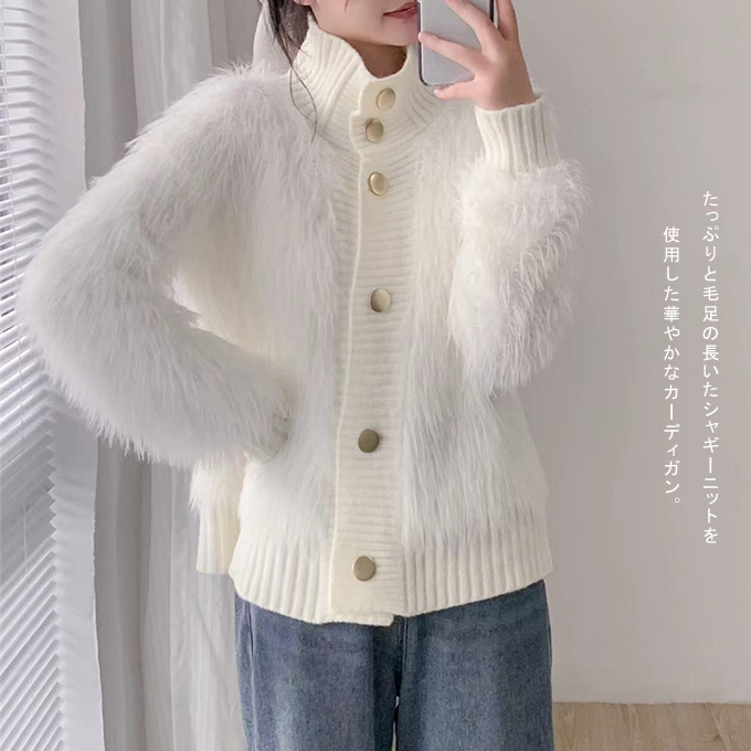 温もり溢れるシャギーニットで華やかに見せるカーディガン。