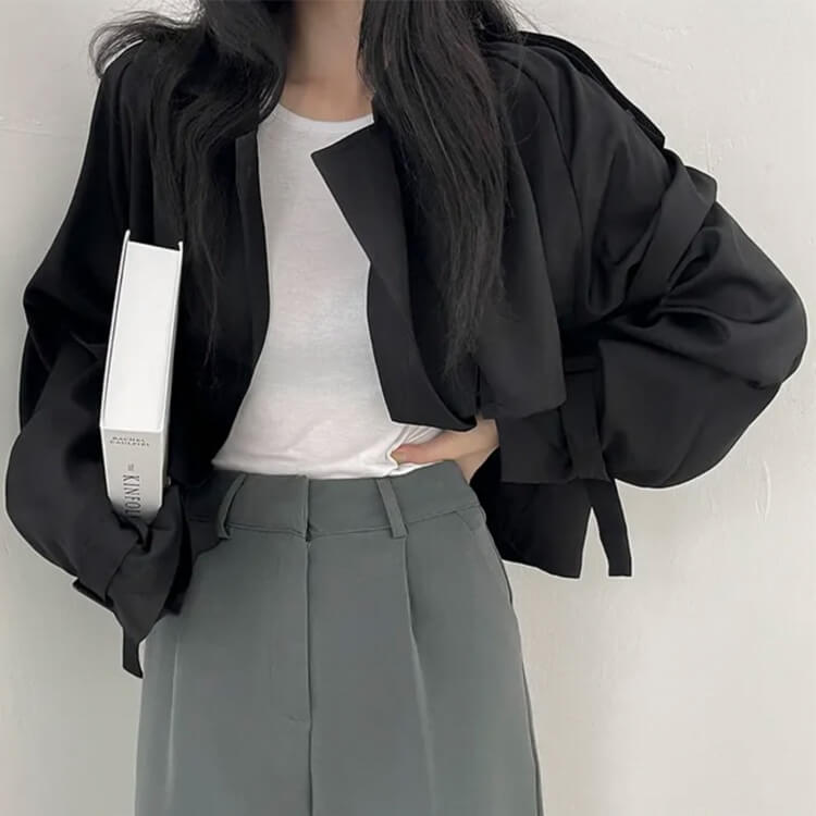 かっちりとしたフォルムとデザインにショート丈が着こなしやすくカジュアルキレイな雰囲気に。