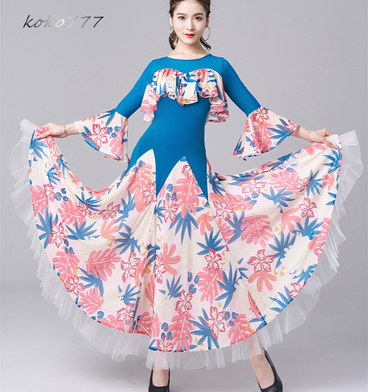 ロングドレス レディース ワンピース ラテンダンス 社交ダンス フリル 舞台衣装 公演 パーティー 洋服 花柄 ワルツ イベント服 ナショナルダンス 発表会