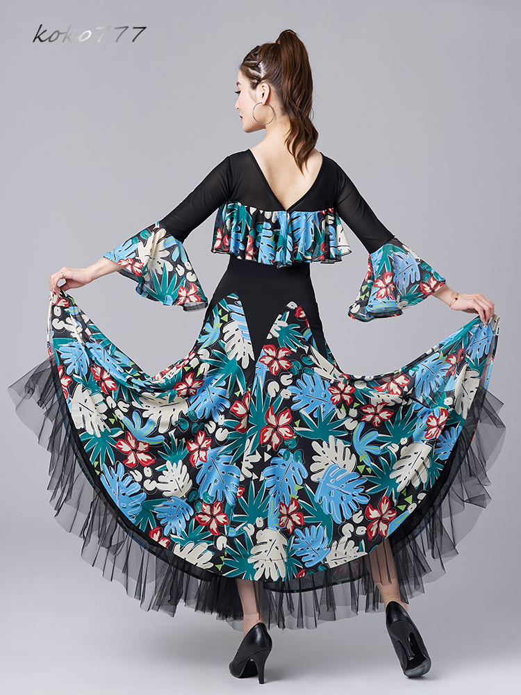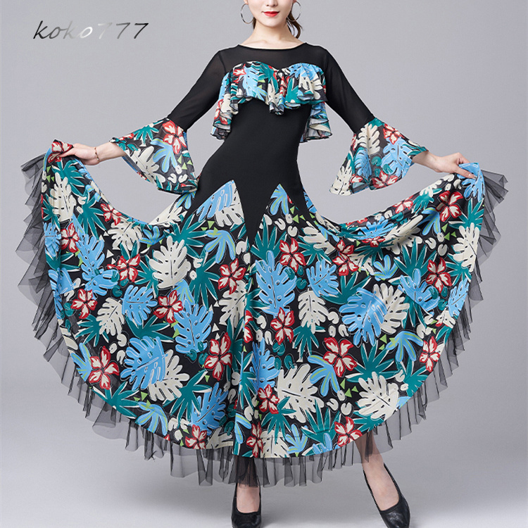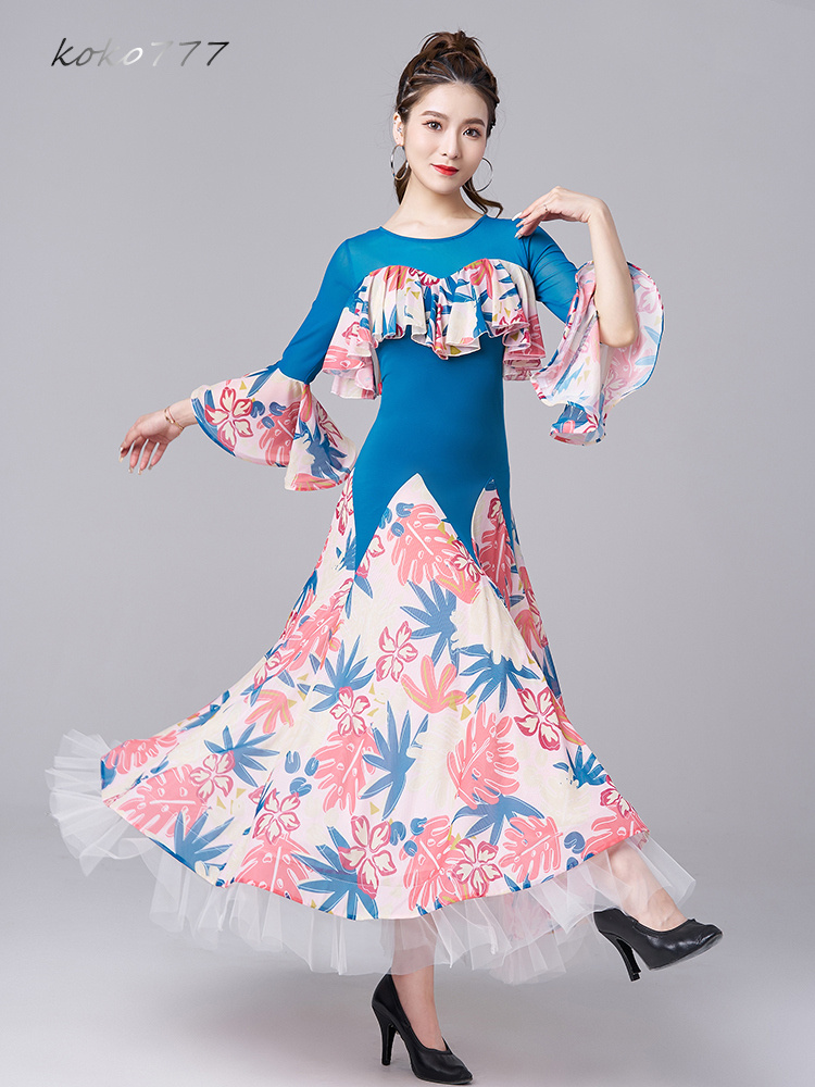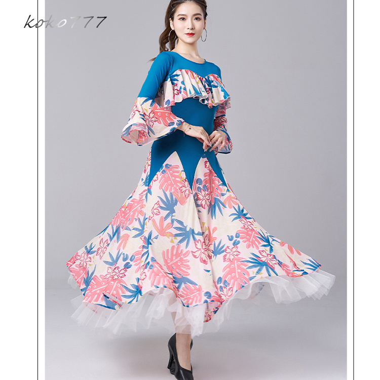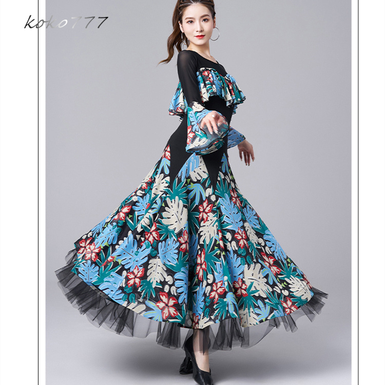 ロングドレス レディース ワンピース ラテンダンス 社交ダンス フリル ワルツ パーティー ナショナルダンス 公演 洋服 舞台衣装 発表会 花柄 イベント服