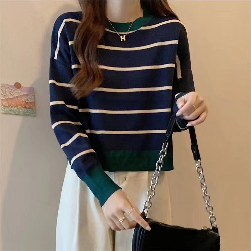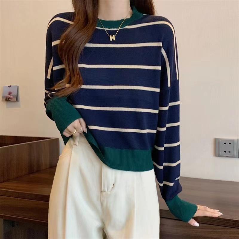 丸首ストライプスリーブショート丈長袖スリムニットボトムブラウス秋春冬婦人服新作セータートップス女