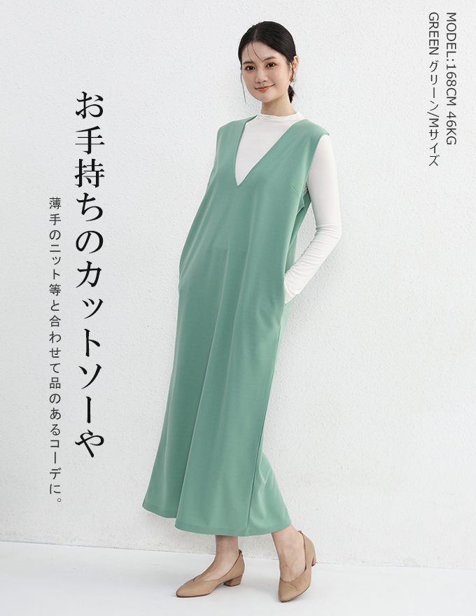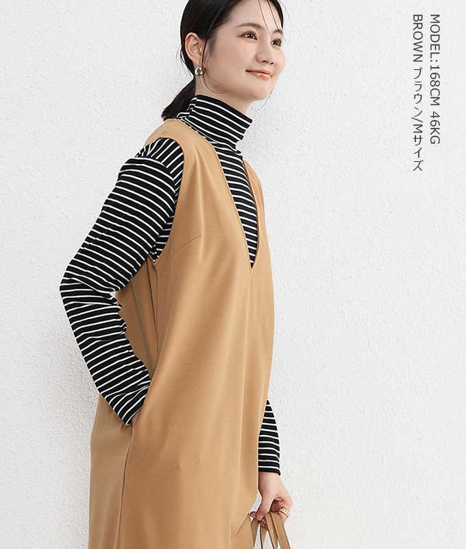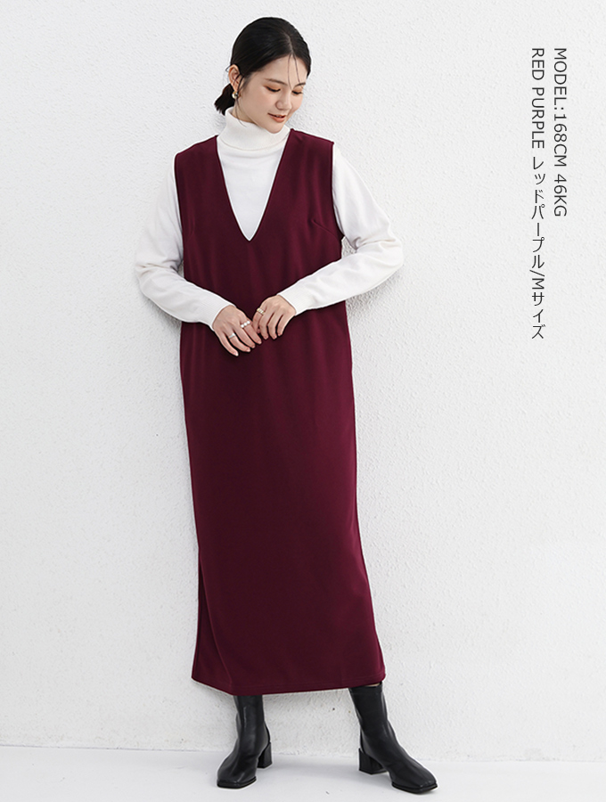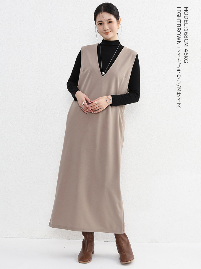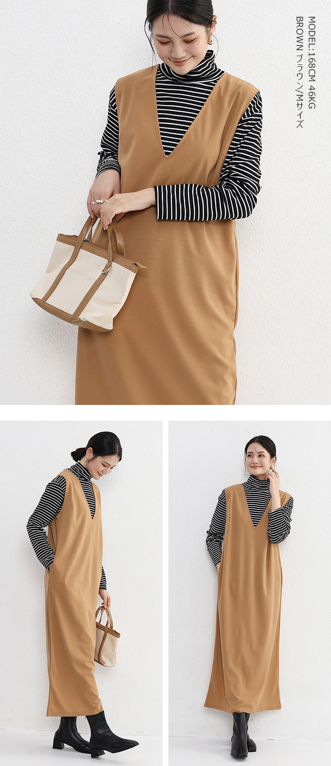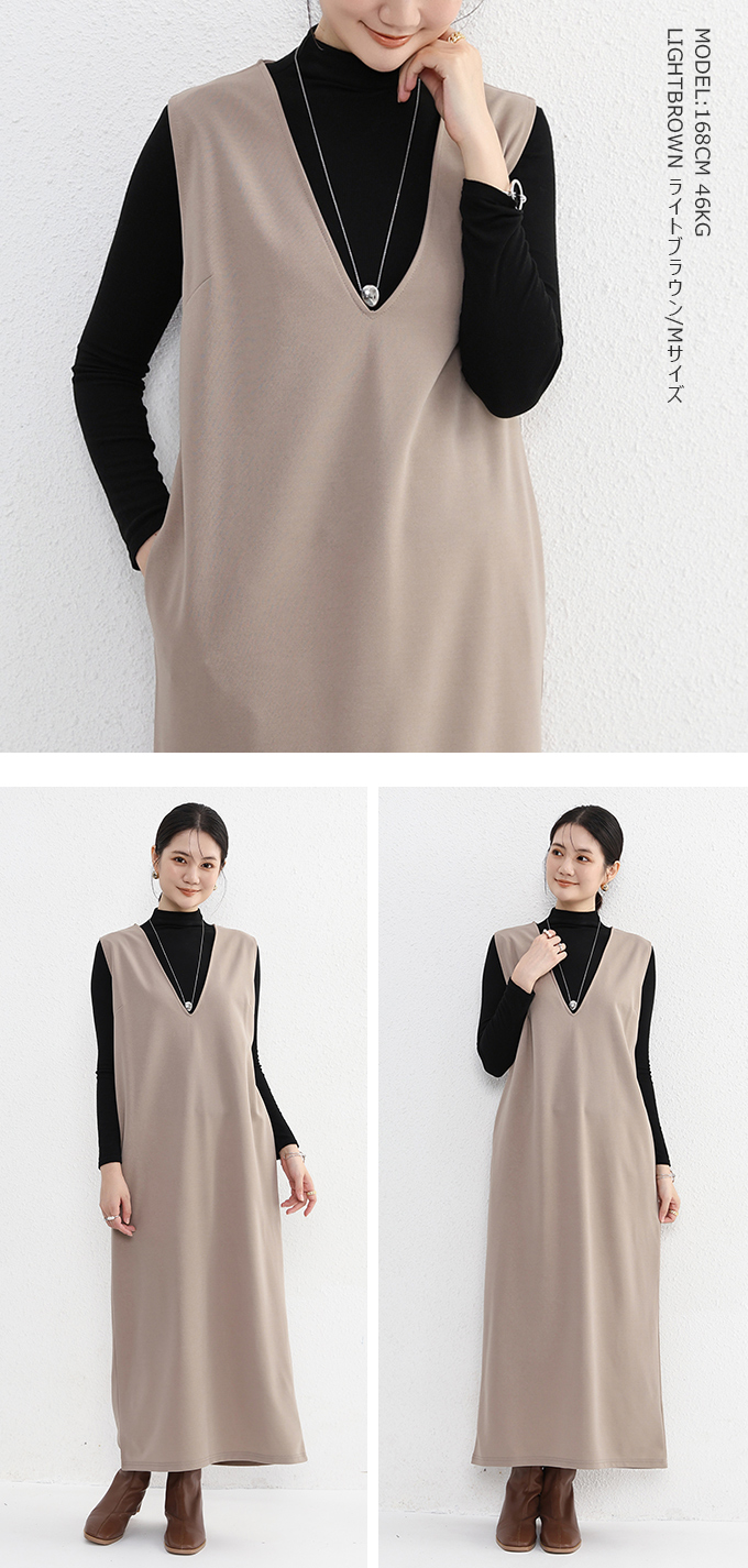 Vネックジャンパースカート ワンピース 体型カバー レイヤード レディース ジャンパースカート