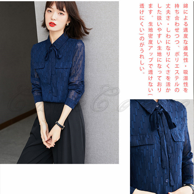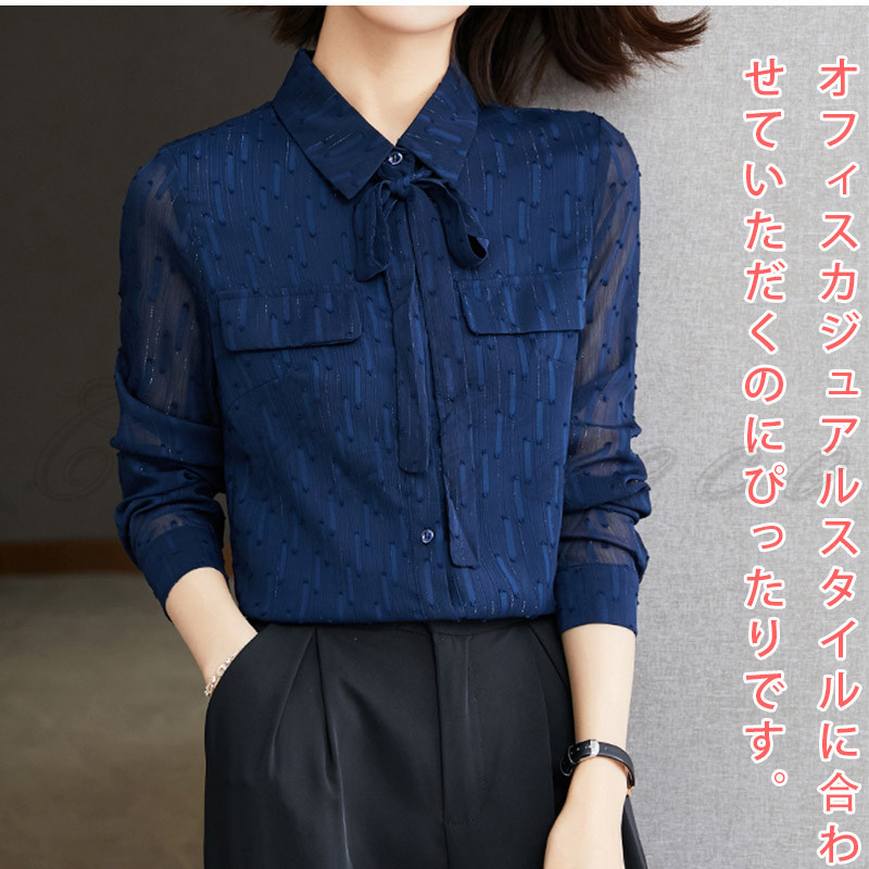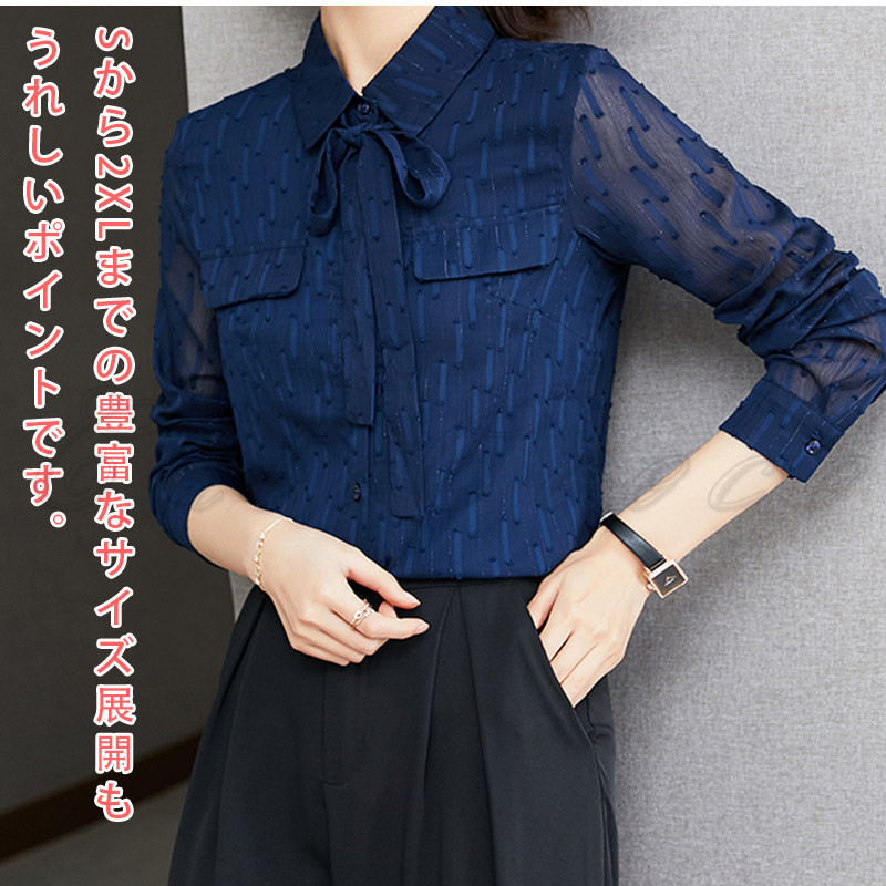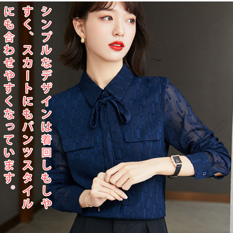シャツ リボン ポケット ブラウス 透け感 オフィス 送料無料 フォーマル シフォンシャツ 結婚式 お洒落 通勤 就活 OL レディース ビジネス 高級感 長袖