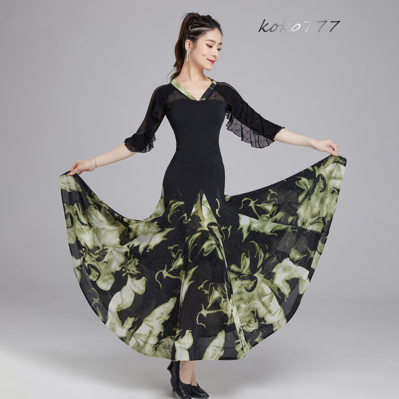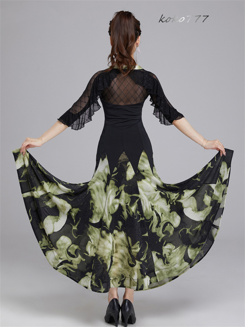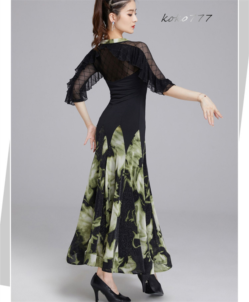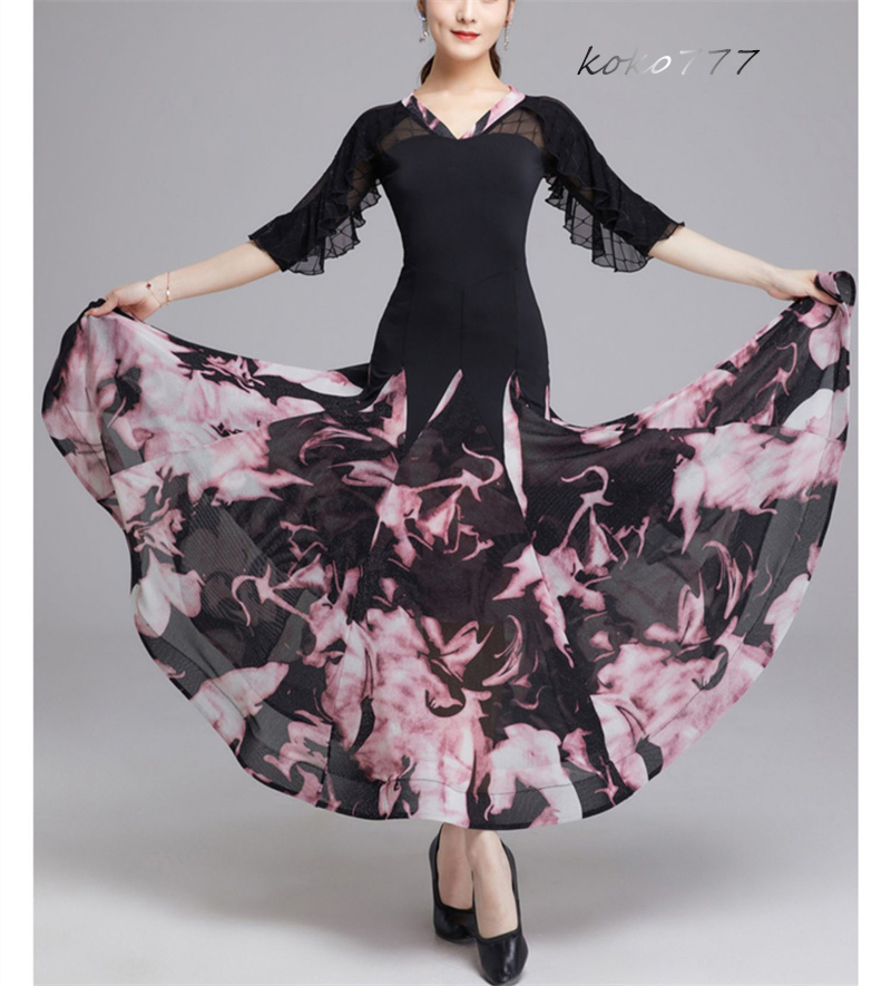 ロングドレス レディース ワンピース ラテンダンス フリル 花柄 モダンダンス 舞台衣装 公演 ワルツ ナショナルダンス 社交ダンス 発表会 部活 パーティー 洋服