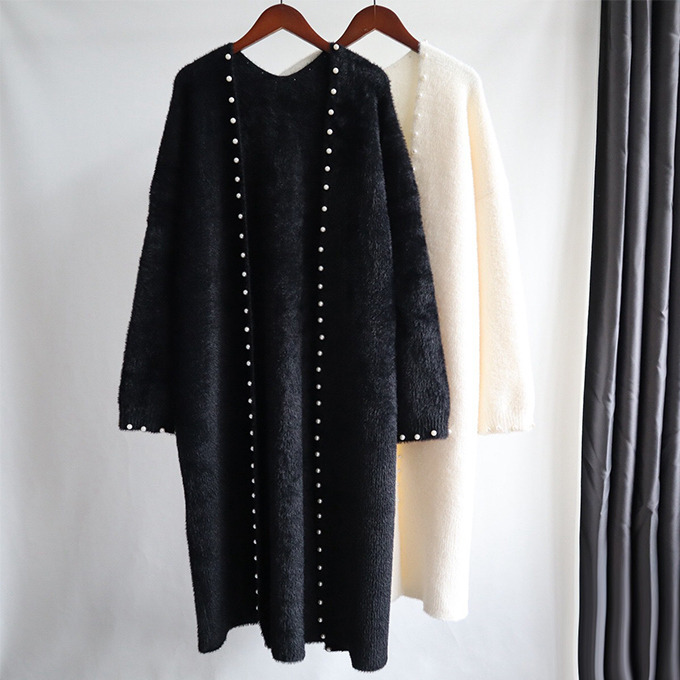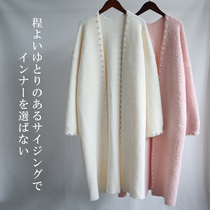 パール付きロングカーディガン ガウン ゆったり こなれ感 はおり シャギーニット ロングカーデ