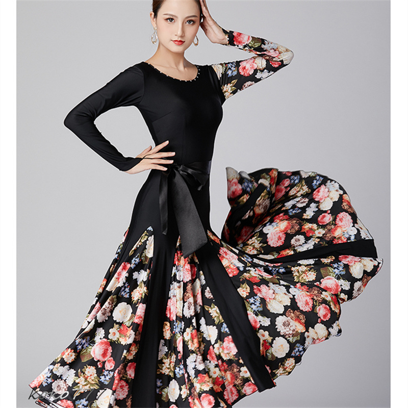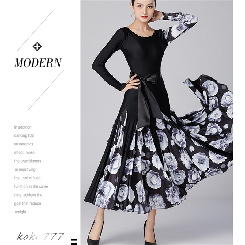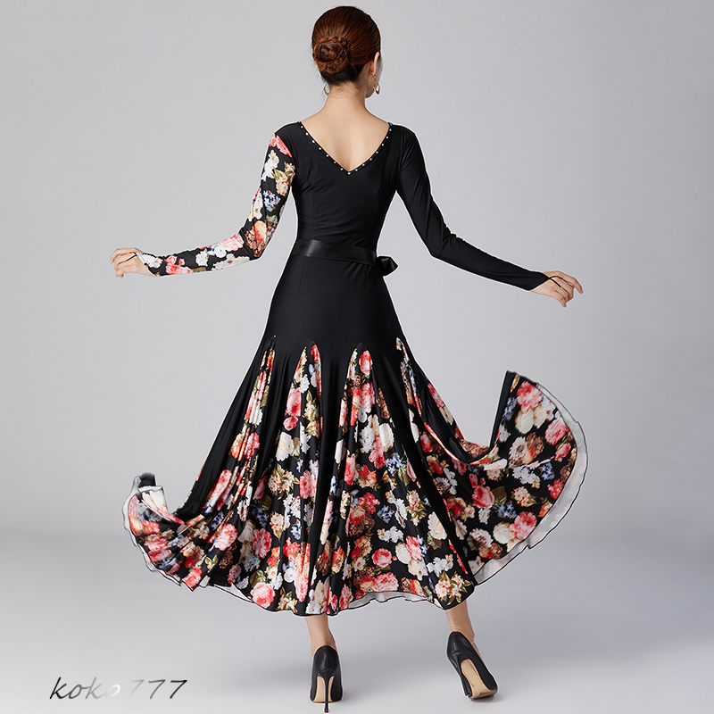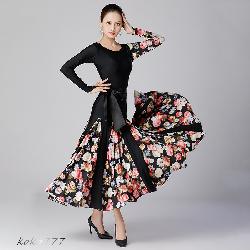 ワンピース レディース ロングドレス ラテンダンス ウェア パーティー 花柄 リボン 舞台衣装 社交ダンス モダンダンス ナショナルダンス ワルツ 発表会