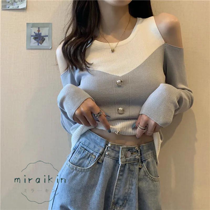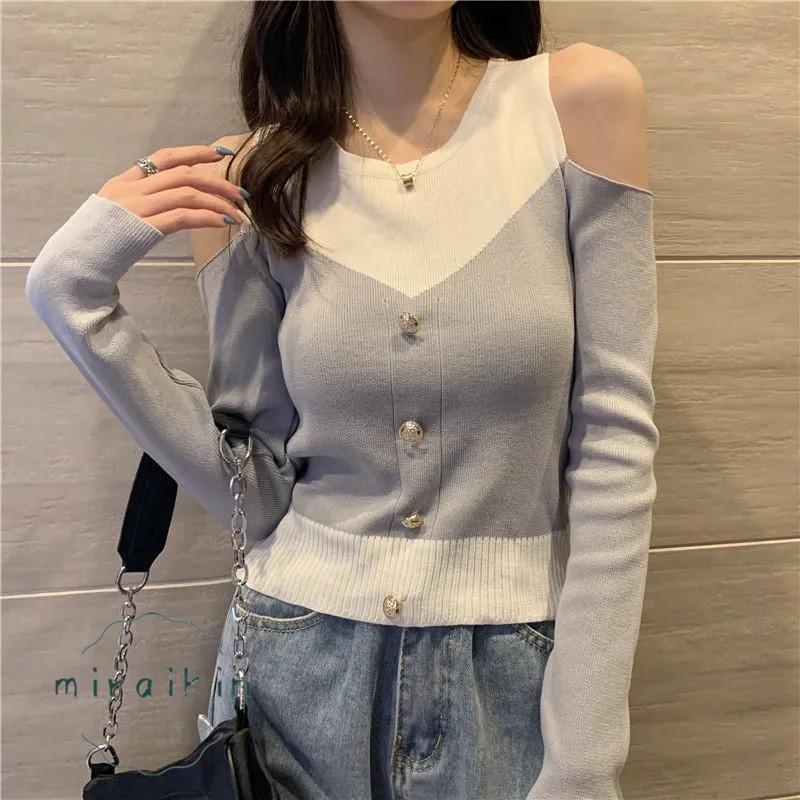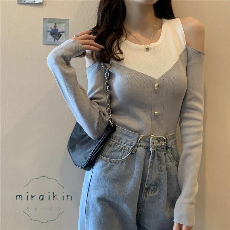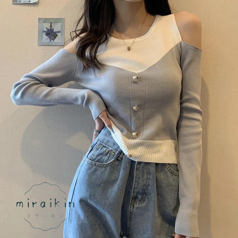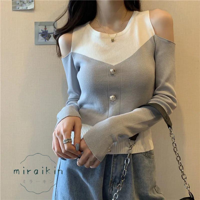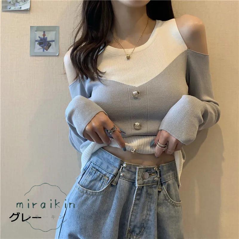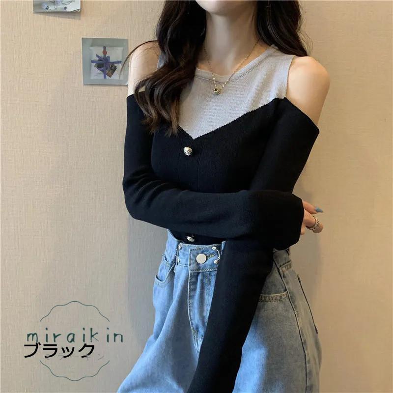 ニットトップス 長袖 リブニット 肩出し ボタンデザイン ドッキング セーター おしゃれ 韓国ファッション オフショルダー セクシー オシャレ 綺麗