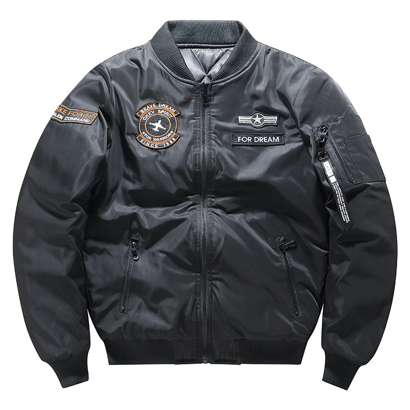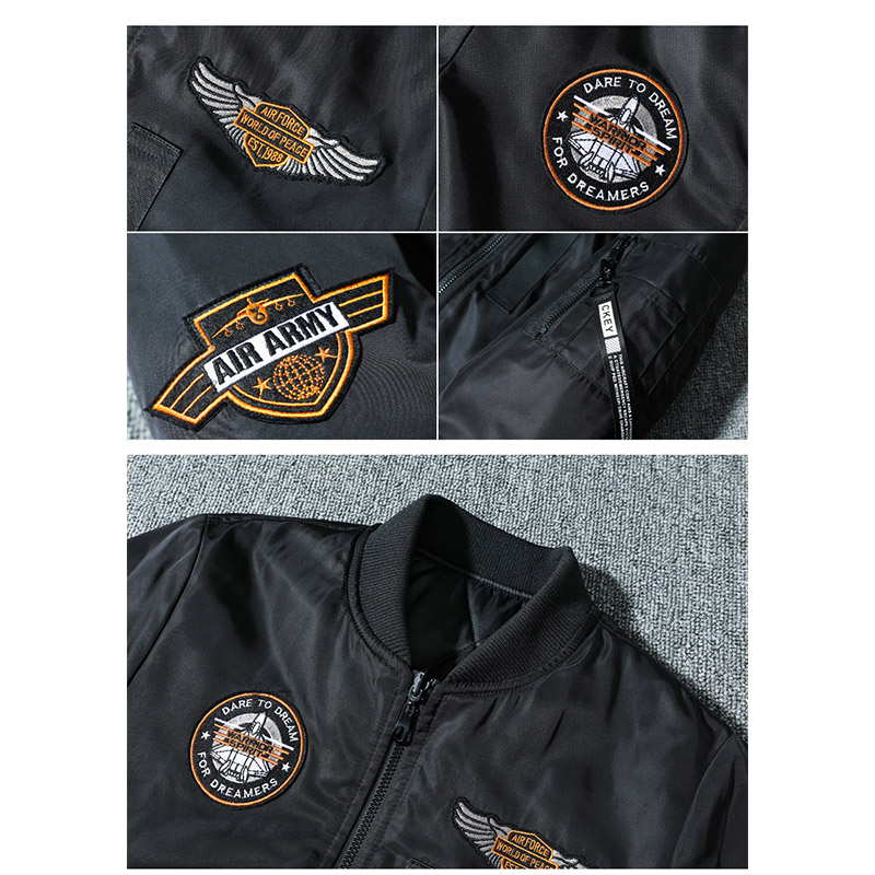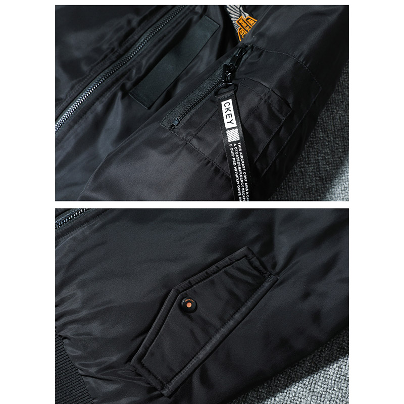 [おしゃれなMA-1スタイル] かっこいいMA-1フライトジャケットは今年のトレンド。フライトのワッペンや刺繍の飛行機でカスタムを加えたメンズジャケット。ボタン付き両側のポケット、裏ポケットと袖ポケットはスマートフォンなどの小物を入れておくことも可能があります。
